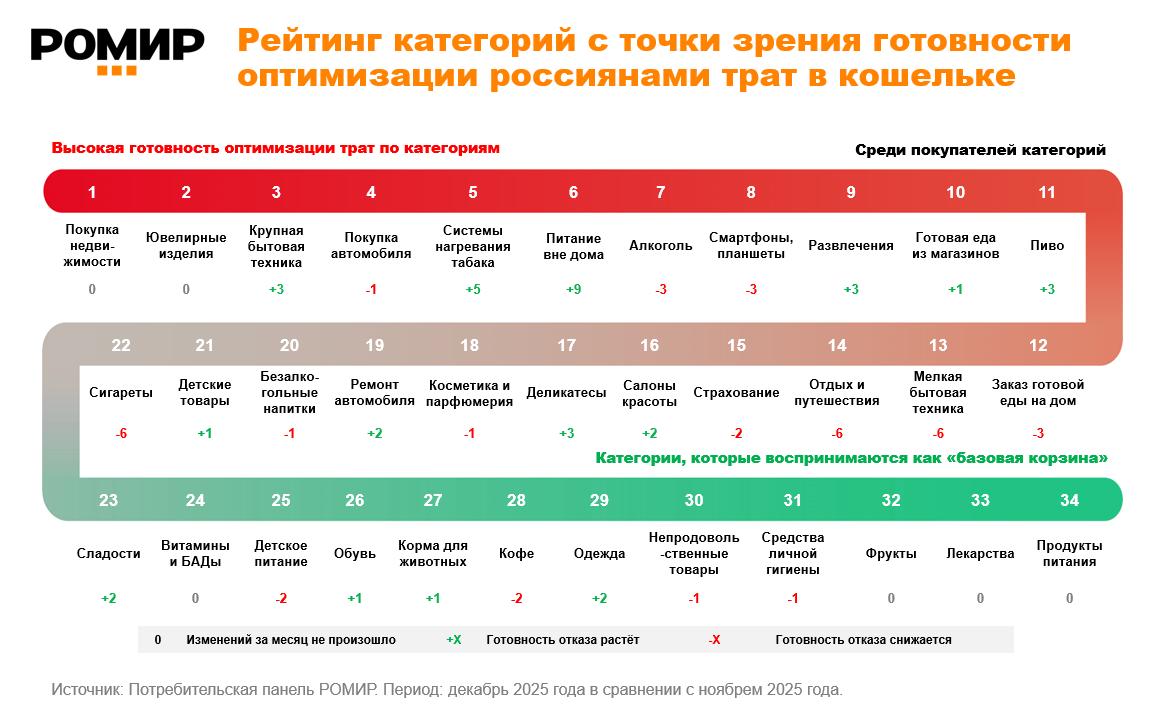 Недавно наткнулась на любопытное исследование от «Ромир» про то, от чего россияне готовы отказаться, а на чем экономить совсем не хотят. По сути получилась такая «пирамида Маслоу в кошельке» — очень наглядный срез потребительских приоритетов.