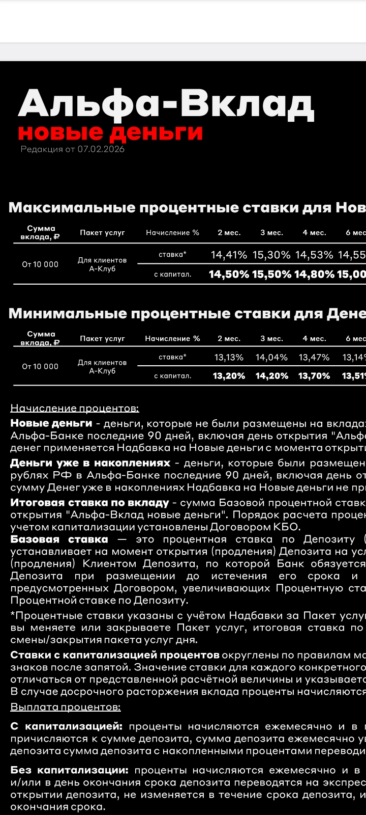 Мой анализ талицы флагманских вкладов: ,, Новые деньги,, и ,, Максимальный,, из линейки вкладов Альфа-Банка по новым изменениям по вкладам по состоянию на 7феврля 2026г. Наибольшая ставка , сейчас, предлагается по вкладу ,, Новые деньги ,, на сроке 91дн - 15, 1% (ставки указаны с капитализацией %) , для Онли- 15, 3% . На других сроках ставки ниже, гораздо, по этому вкладу. По вкладу ,, Максимальный,, , аналогично, на этом сроке ставка - 15, 0% и для Онли- 15, 2% (ставки по вкладу...
