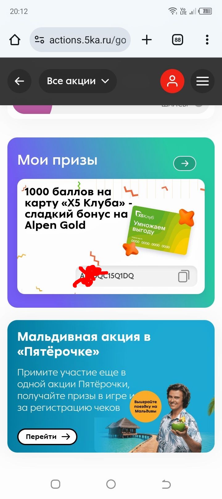 Второй момент: в приложении "Пятерочка" нужно найти подарочный код и ввести его на главной странице. За это будут начислены 1000 апельсинок, что соответствует 100 рублям. Неплохой подарок, не правда ли? Такой маневр я сделала вчера вечером, деньги зачислились спустя пять минут. Показываю скриншот страницы с кодом.