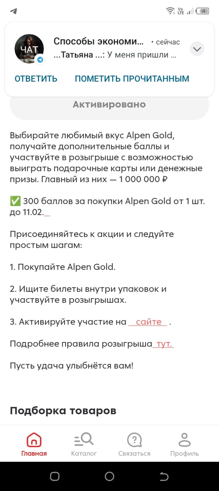 Во-первых, нужно иметь "Апельсиновую карту" "Альфа-банка", чтобы рассчитываться ею за покупки в магазине " Пятерочка". Меня, как пенсионерку, привлекает этот магазин, а ещё я мониторю приложение " Пятерочки" и активирую интересные для меня акции. В феврале появилась акция за покупку шоколада Alpen Gold.