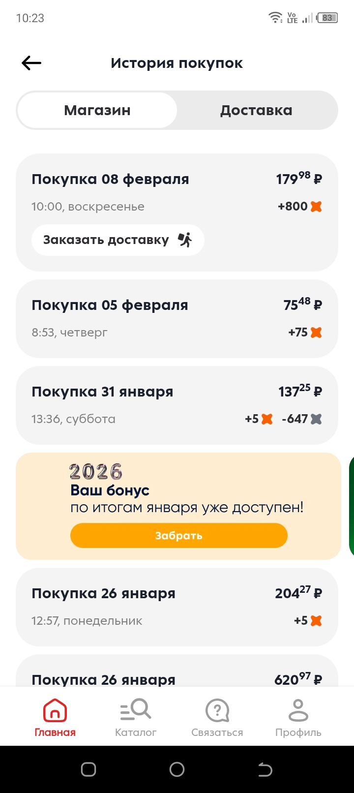 Далее, мы, по желанию, идём в "Пятерочку" и покупаем шоколад, если хотим принимать дальнейшее участие в розыгрыше призов. Я сходила с утра, купила пару плиток, за это мне сразу же начислили 800 апельсинок = 80 рублей.