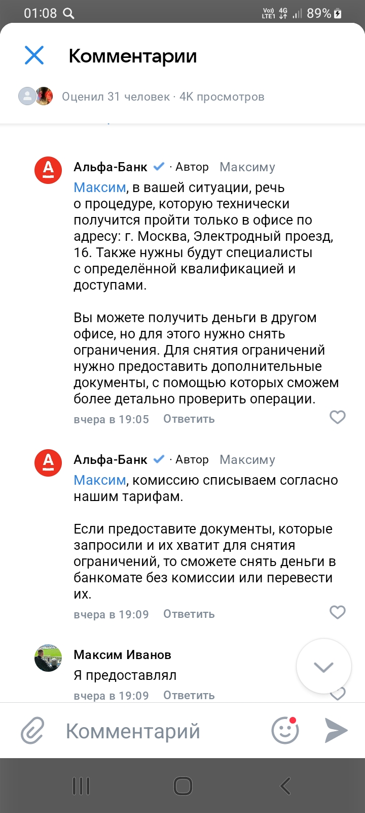 На Площадке Диалог банки ру . уже видел посты , с описанием ситуации,в которых клиента банка посылали в Москву , для разблокировки. Пользователем площадки описавылась ситуация, по Альфа-Банку. по блокировке , после внесения крупной суммы ( 400т ₽ )через банкомат. Я , как и другие пользователи Диалога , по описанию ситуации , предпологал, что ехать в Москву излишне, но , видимо, ,алгоритм действий и требования по разблокировки сменились , видимо, ситуация не единственная, в связи...