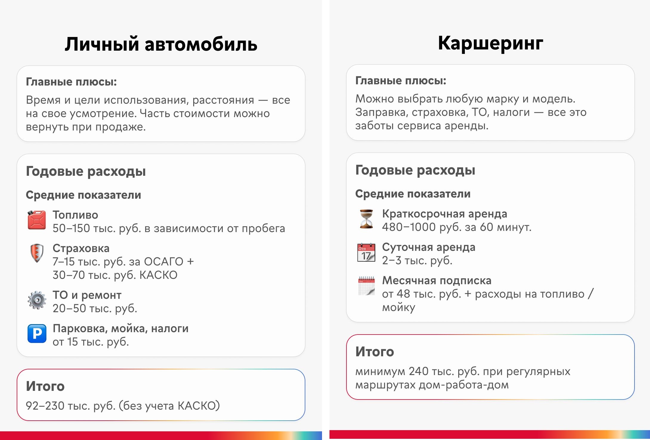 Эксперты говорят: каршеринг идеален для редких поездок, а для частых и длительных — все-таки личный автомобиль. Ниже сравниваем средние расходы.