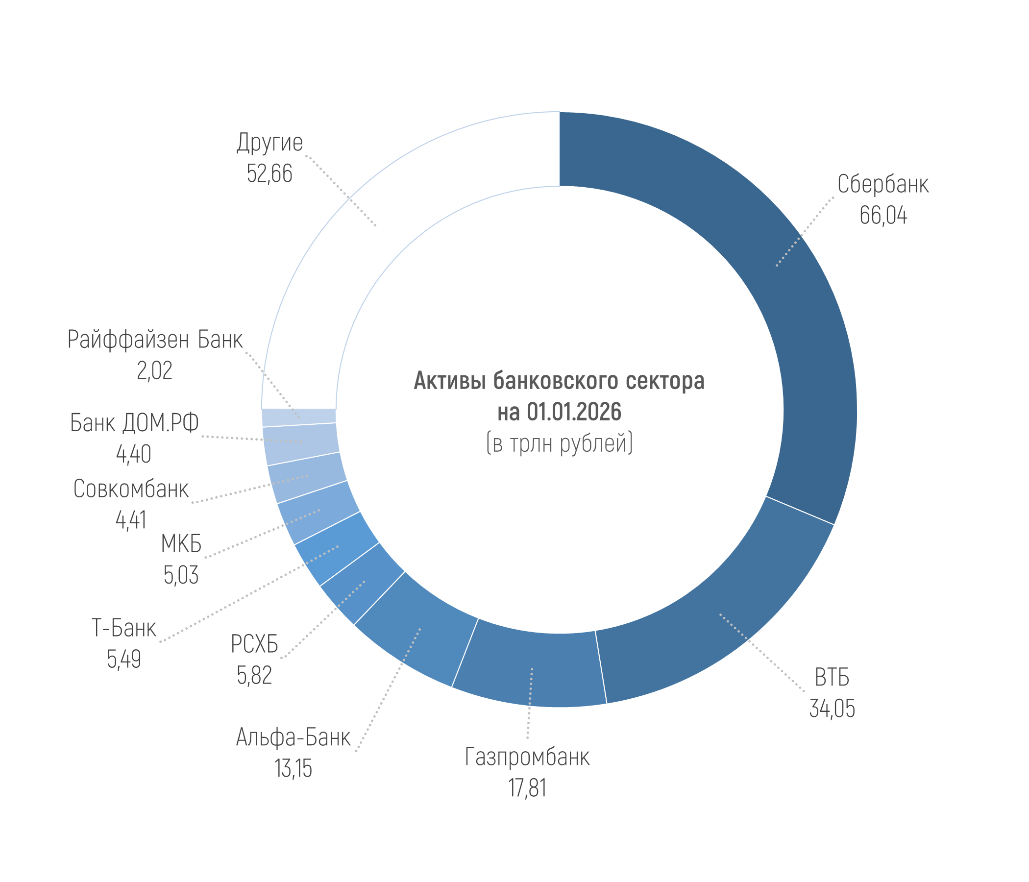 По данным материала ЦБ о развитии банковского сектора, активы российских кредитных организаций составили 210,87 трлн рублей на 01.01.2026, увеличившись на 0,9%, или на 1,96 трлн рублей в декабре 2025 года. Рост активов за 2025 год составил 5,8%, или 11,6 трлн рублей.