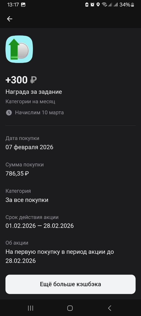 Сразу подключил. Оплатили покупка в 5-ке Апельсиновой картой. Кэшбэк начислен, и будет выплачен после 10-го марта.