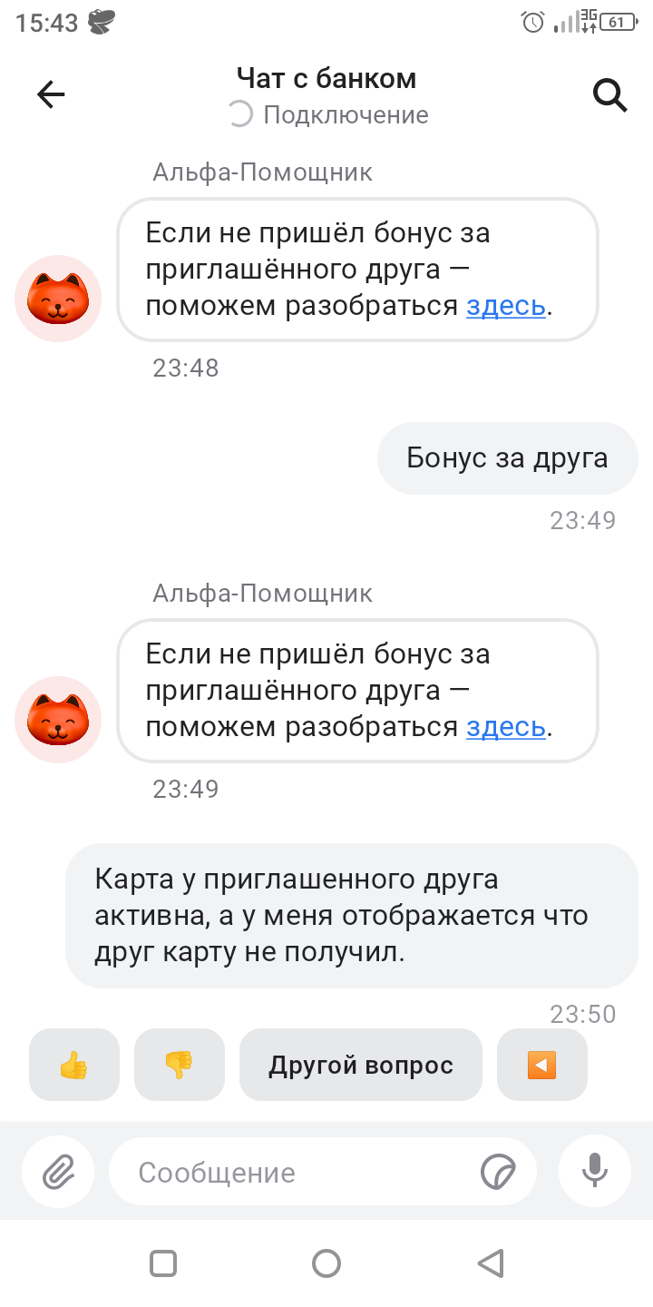 Хочу поблагодарить команду Банки.ру и поделиться опытом взаимодействия с Альфа банком. Всё началось с совета дебетовой карты Альфа банку своей супруге. Но обещанные деньги по программе приведи друга я так и не получил, хотя был уверен что счета и карты у супруги в этом банке открыты не были.