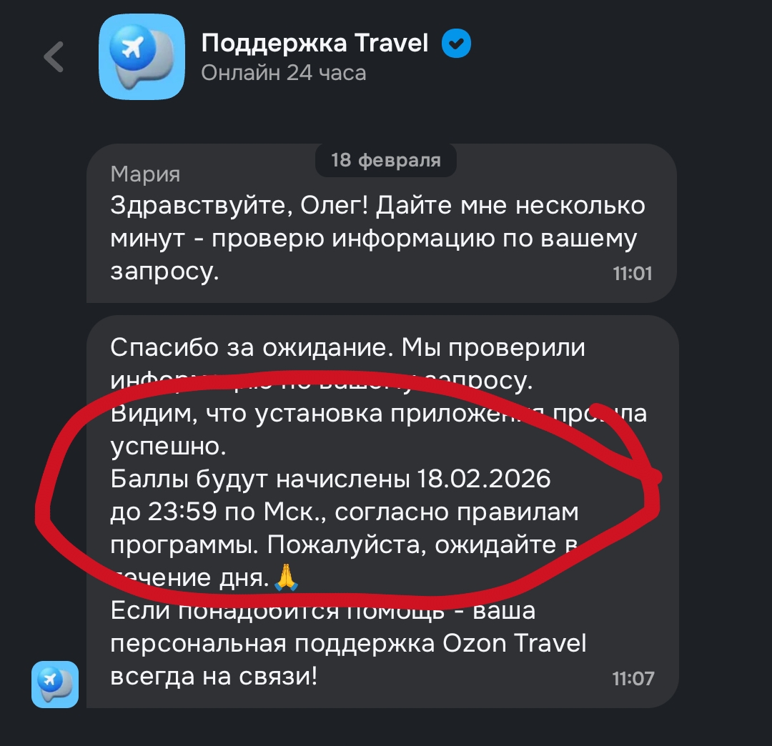 В один прекрасный день, а точнее, утро из-под каиеры смартфона выскочил радостный пуш от OZON TRAVEL: поставь наше приложение и получи 100 баллов! Я тут же установил этот Ozon Travel. По условиям акции мне должны были начислить 100 баллов Озон до 23:59 18 февраля. 18 февраля я ждал весь день. Проверял счёт утром, днём, вечером. В 23:59 баллов не было.