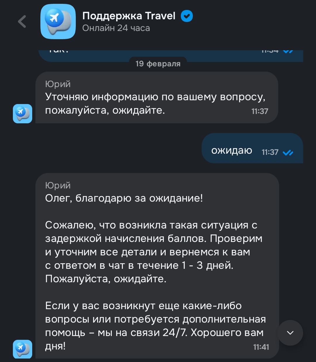 Пишу утром сегодня 19 февраля. Ответ: «Сожалею, что возникла задержка. Проверим детали и вернёмся с ответом в чат в течение 1–3 дней. Пожалуйста, ожидайте».