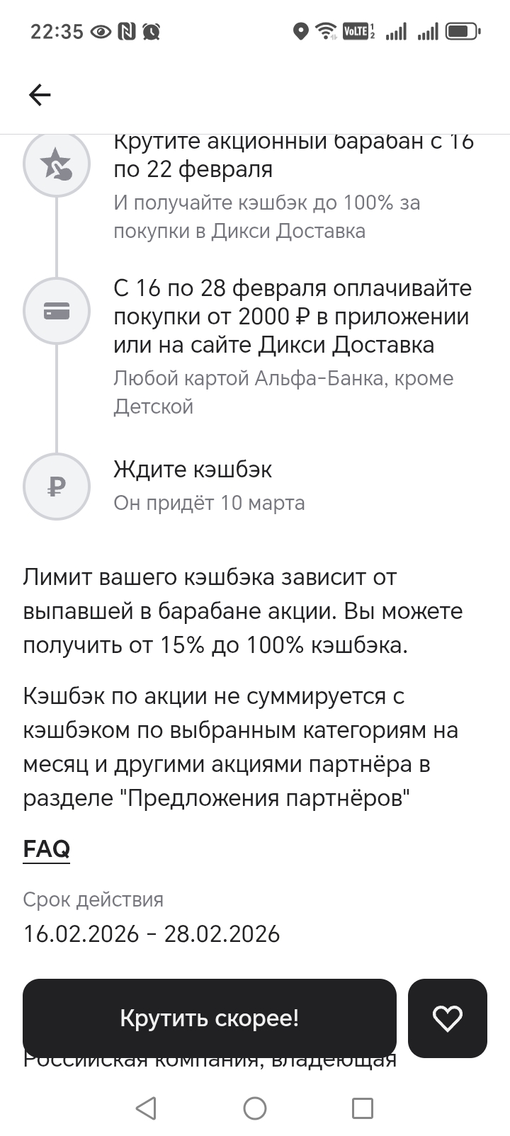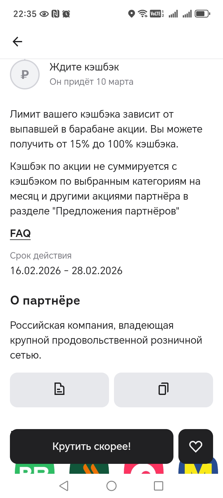 В предложениях партнеров по кэшбэку появилось новое предложение (надеюсь,что у всех) в продуктах от Дикси доставка. Кэшбэк до 100 %, у меня 30% выпало, что так же отлично, правда мой предел 600 рублей только. Попробуйте в своих приложениях, может повезет.