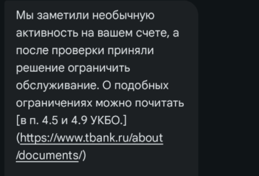 Я обращаюсь ко всем кто меня читает не рекомендую вам тбанк так как столкнулся с одной проблемой сколько лет пользовался их услугами никаких проблем не возникало с переводами онлайн покупки совершал и сегодня просто взяли наложили ограничения и закрыли доступ к банку не могу войти банк третьи лица не пользовались моей картой .