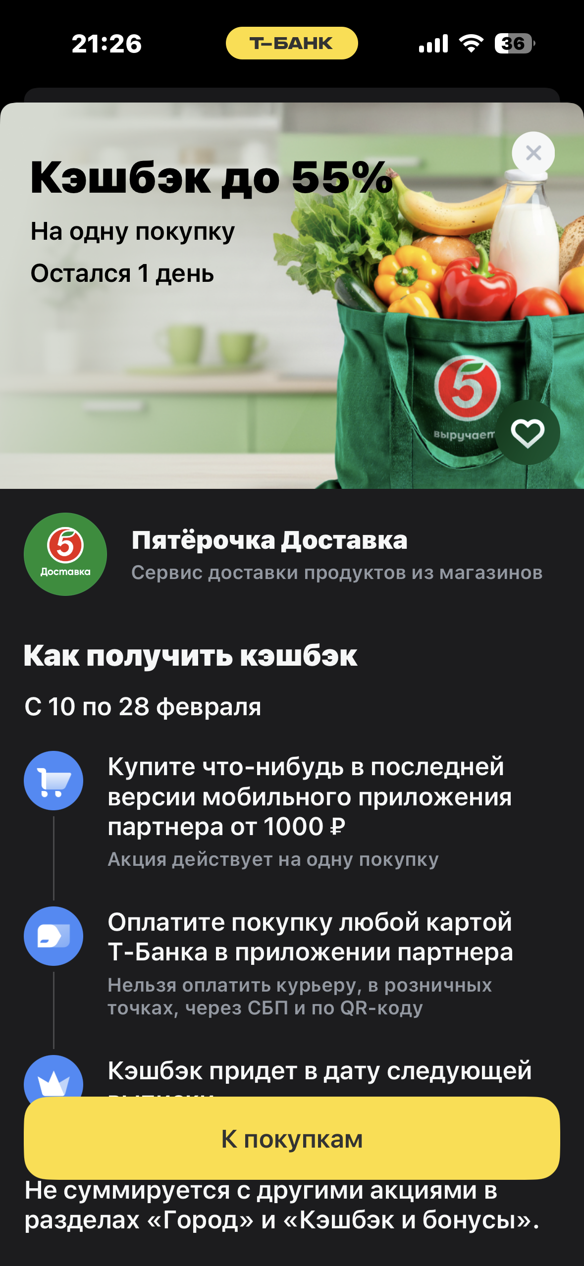 Чаще всего свой кешбэк я получаю апельсинками, купив товары в Пятёрочке или сделав в ней же доставку. Кешбэк апельсинками не превышает 600 - 1000 рублей в месяц. В начале месяца в приложении Пятёрочка просматриваю категории и отмечаю те, которые мне понадобятся.