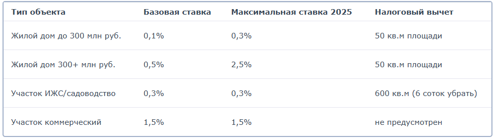 Федеральная ставка для домов до 300 млн рублей составляет 0,1%, но может корректироваться муниципалитетами в пределах закона. При расчёте автоматически применяется вычет в размере стоимости 50 кв.м жилой площади.