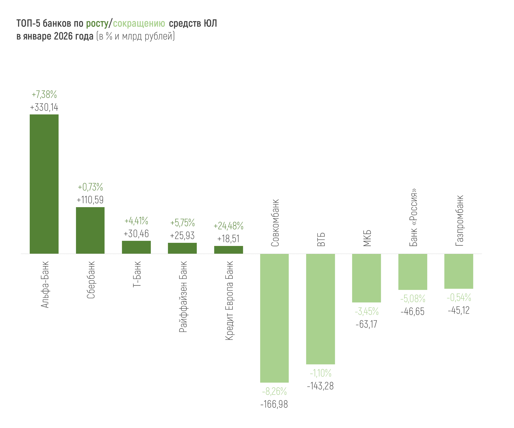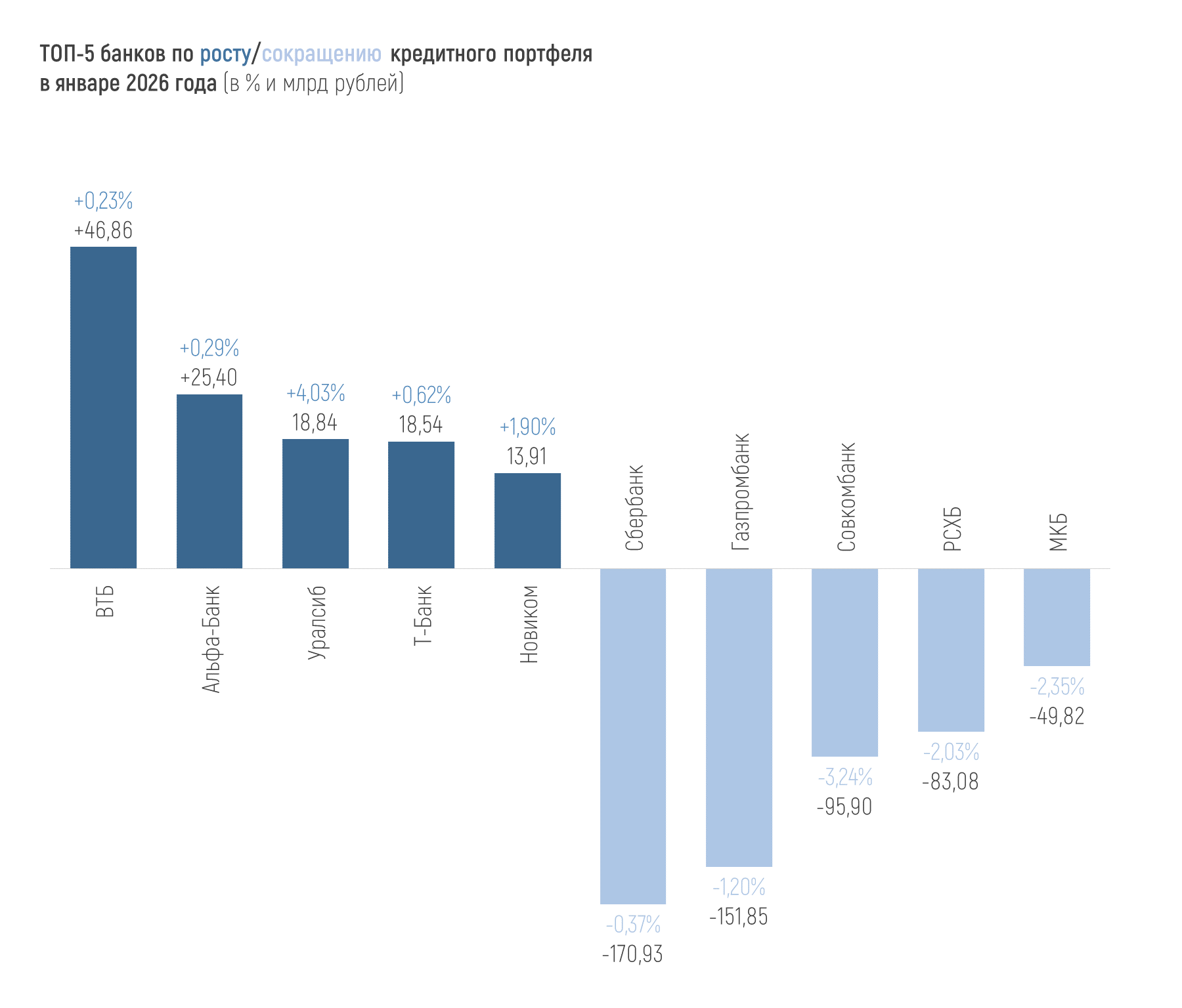 Только 7 из 20 крупнейших банков по величине активов в финрейтинге Банки.ру (без учета Национального клирингового центра и Национального расчетного депозитария) показывают рост активов за январь 2026 года.