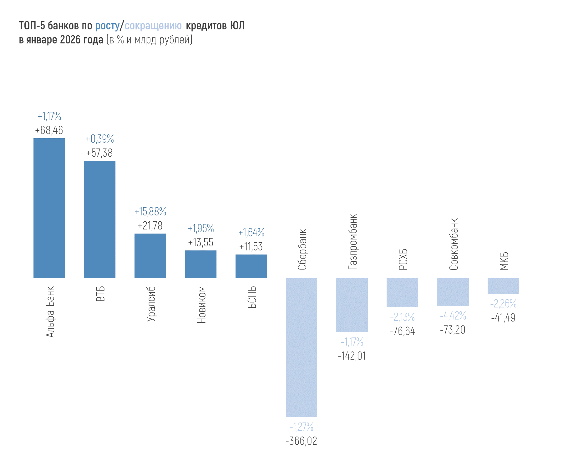 В январе 2025 года портфель кредитов, выданных юрлицам (с учетом начисленных процентов), сократился почти на 1,2% и к 01.02.2026 года составлял 95,46 трлн рублей.