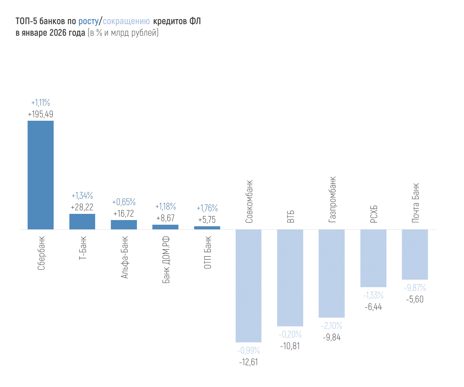 Совокупный кредитный портфель российских банков в январе уменьшился на 0,8% и составил 126,29 трлн рублей к 01.02.2026 года. За весь 2025 год кредитный портфель прибавил 7,71 трлн рублей, или 6,4%.
