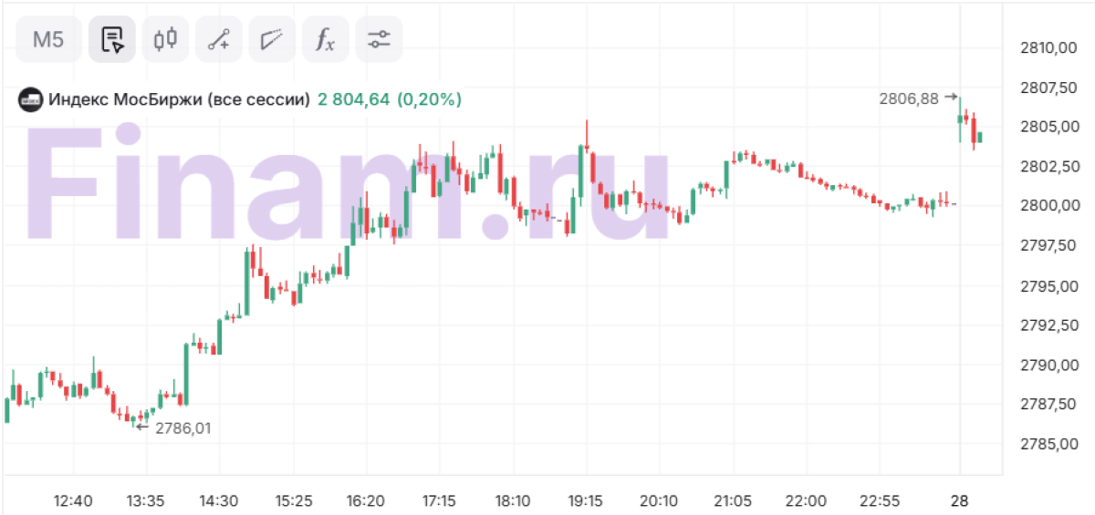 Российский рынок слегка подрастает в субботу, 28 февраля, К 10:16 мск индекс МосБиржи повышается на 0,2%, до 2804,64 пункта, следует из данных торгов.