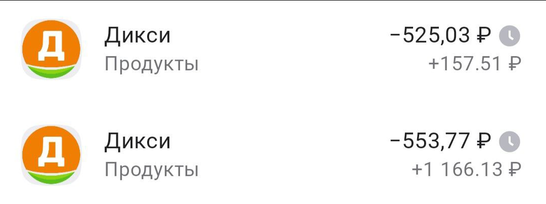 Кешбэк от Дикси прилетел сразу же, и можно сказать, что эти продукты обошлись не в 553 рубля, а в 387. Можно было бы так сказать, но у меня отображается то ли глюк, то ли совмещение акций и кешбэк выглядит вот так: