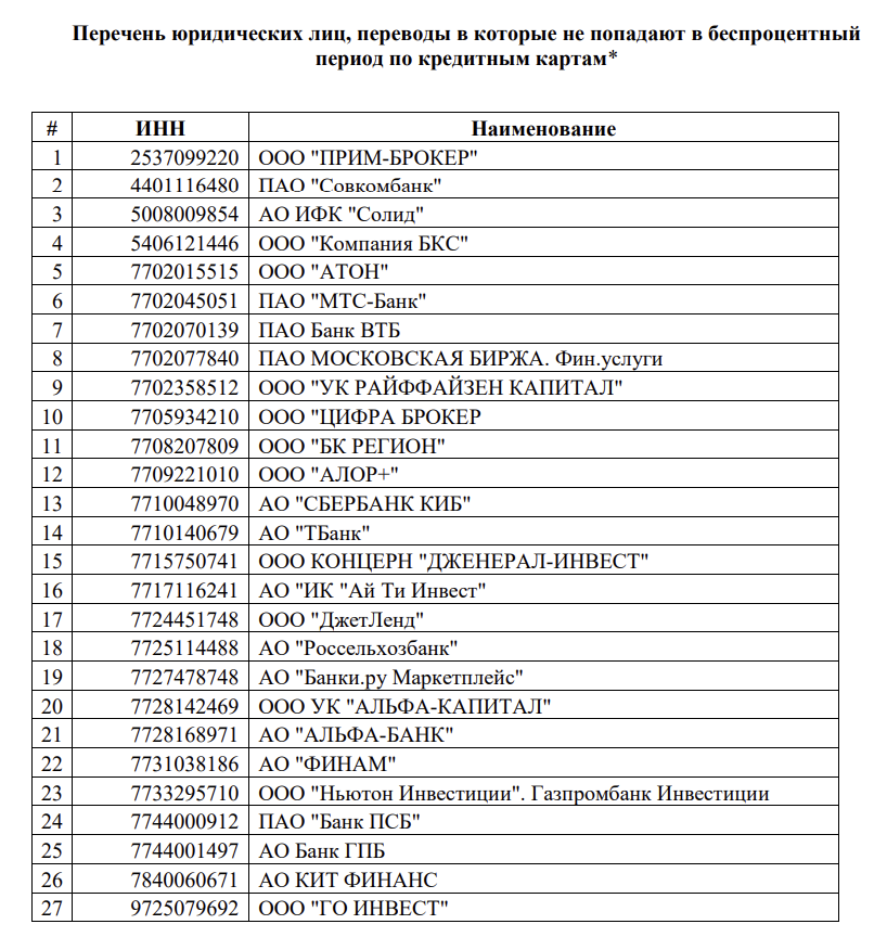 заметил, что Сбербанк обновил перечень юридических лиц, переводы в которые не попадают в беспроцентный период по кредитным картам.