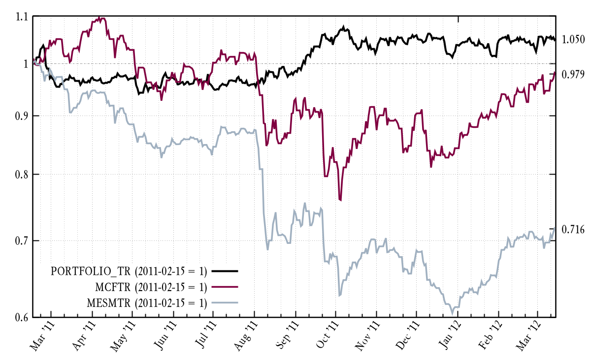 Как можно видеть в сравнении с двумя индексами (полной доходности голубых фишек — MCFTR и второго эшелона — MESMTR), портфель благополучно избежал падения акций летом-осенью 2011 г., потому что... акций в нем почти не было. Но позднее их доля начала расти. Основной темой стала намечавшаяся стагфляция, что побудило сосредоточиться на производителях FEW-товаров (Food, Energy, Water). Так в активах появились акции «Мосэнерго», агрохолдингов «Разгуляй» (пять лет спустя будет обанкрочен и поглощен «Русагро») и «Черкизово». Хотя данная конструкция долгое время будет тянуть портфель вниз, был решительно взят курс на окончательный выход из вкладов.