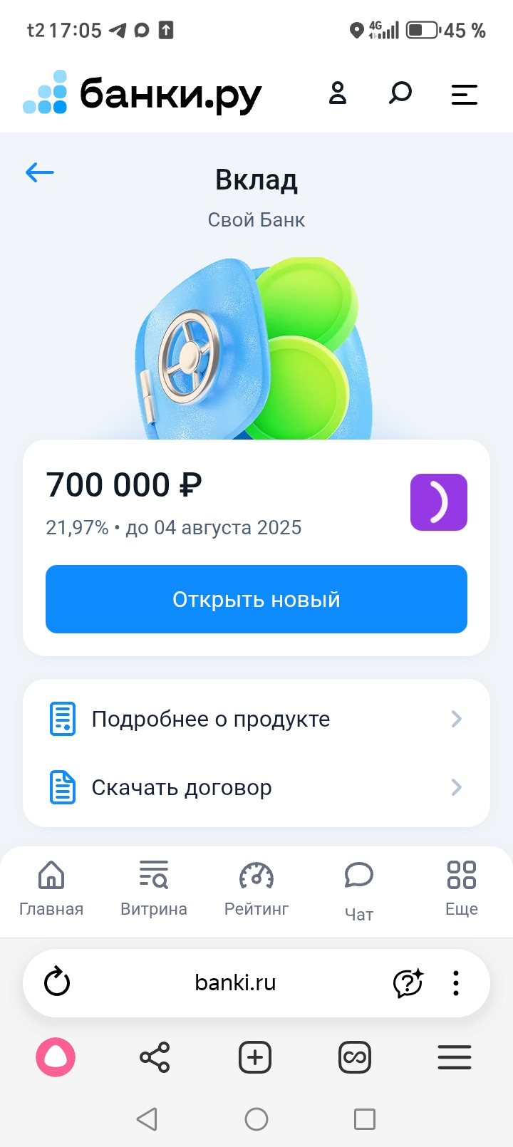 В начале 2025 года банки наперебой предлагали вклады, накопительные счета под высокий процент, особенно, если сравнивать с нынешней ситуацией. Я внимательно изучала, рассматривала, просчитывала все предложения. В конце января 2025 года у нас с мужем закончился срок вкладов и вместо с капитализацией образовалась приличная сумма - 700 000 руб. А в нашем популярном Маркетплейсе Банки. Ру появилось очень привлекательное предложение : ✔️ Открыть на платформе Банки. Ру первый ВКЛАД в Банке СВОЙ с доходностью 21,97% на 181 день и получить дополнительный бонус в размере 3000 Банкимани в качестве вознаграждения.