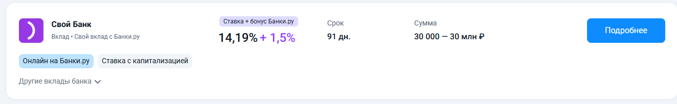 «Максимальный процент» с ежемесячной выплатой процентов открывается под 13,63%, с ежемесячной капитализацией процентов — под 14,52% годовых. По вкладу «Капитал» максимальная ставка равна 12,5% годовых.