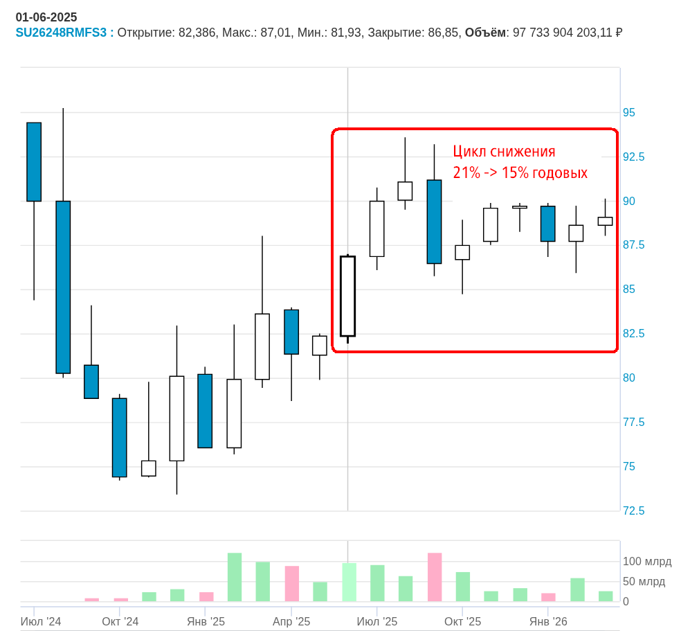 В момент своего дебюта облигация торговалась за 94,5% от номинала, когда ключевая ставка равнялась 16% годовых. Затем она резко подешевела (зависимость цен от ставок — улица с двусторонним движением) при ужесточении политики ЦБ и общем росте доходностей рублевого долга. С июня 2025 г. Банк России начал ключевую ставку снижать, и сейчас она достигла 15% годовых — ниже, чем она была в момент дебюта 26248-ПД. Почему же цена облигаций не восстановилась до тогдашних уровней, а их держатели не заработали ничего, кроме купонов?