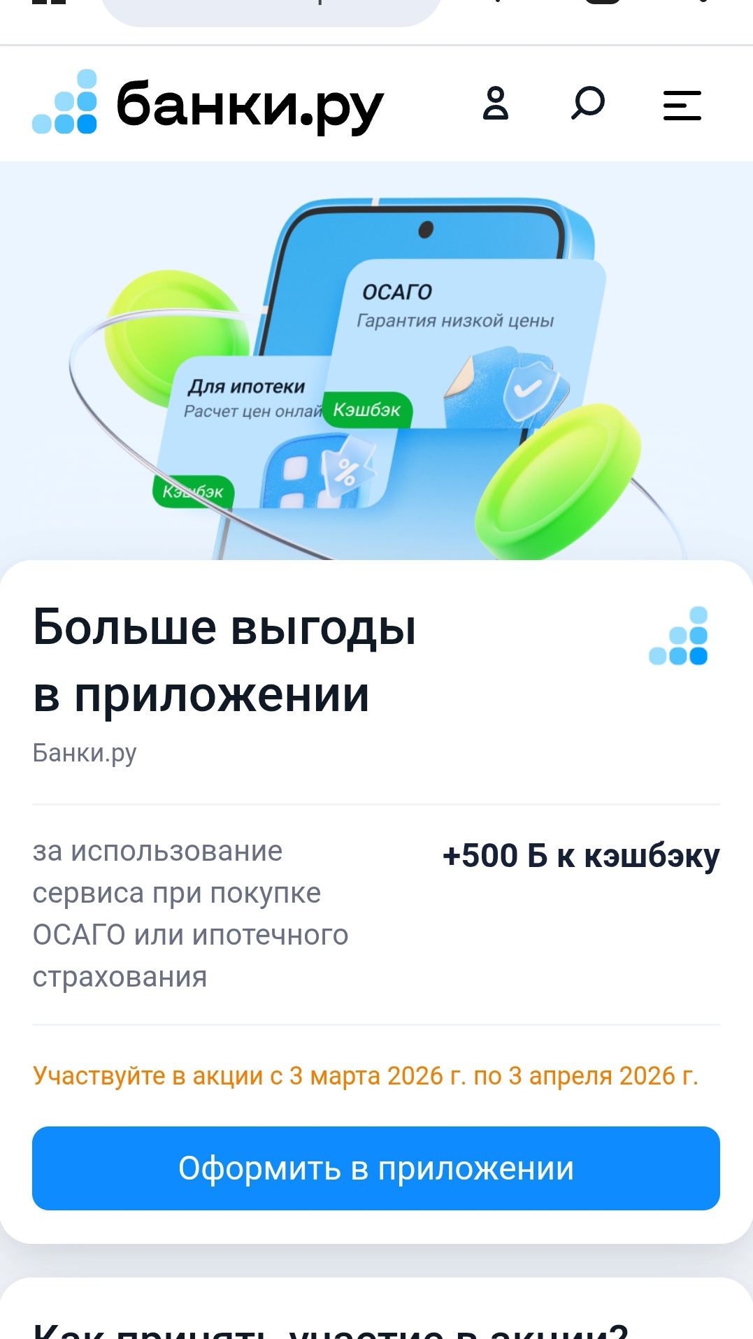 Кэшбек за оформление тоже будет, а бонус 500 Б это приятное дополнение, если оформите в приложении Банки. Ру по данной ссылкеhttps://www.banki.ru/specials/insurance/in-app_bonus