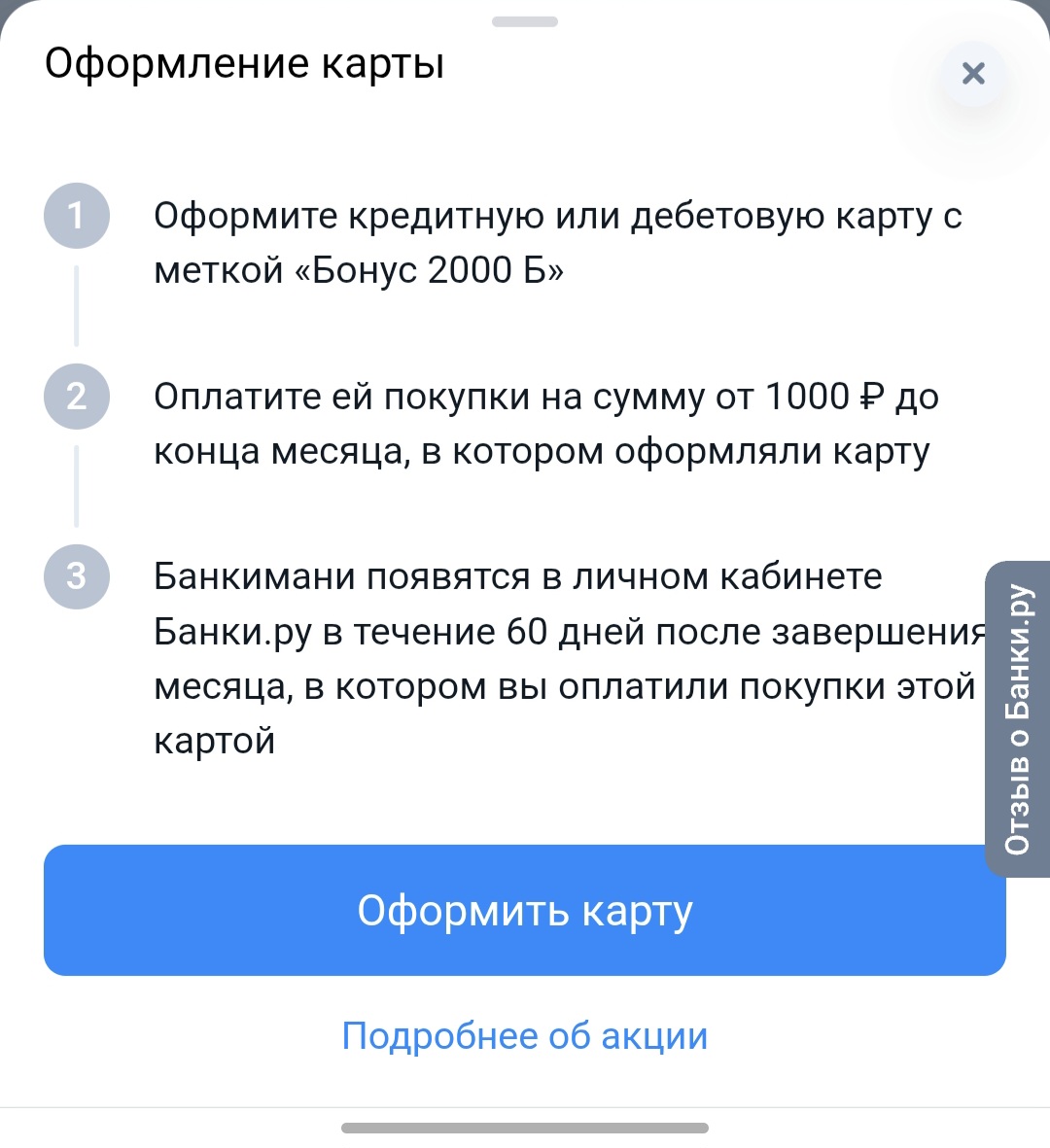 1 марта курьер мне доставил карту, условия для получения бонуса от маркетплейса мною выполнены, остается только дождаться уведомления, где будет написано "начислено 2000 Б за участие в акции: "Бонус за оформление карты" В этом я даже не сомневаюсь, так как платформа всегда выполняла данные ею обязательства при выполнении клиентом условий программы лояльности.