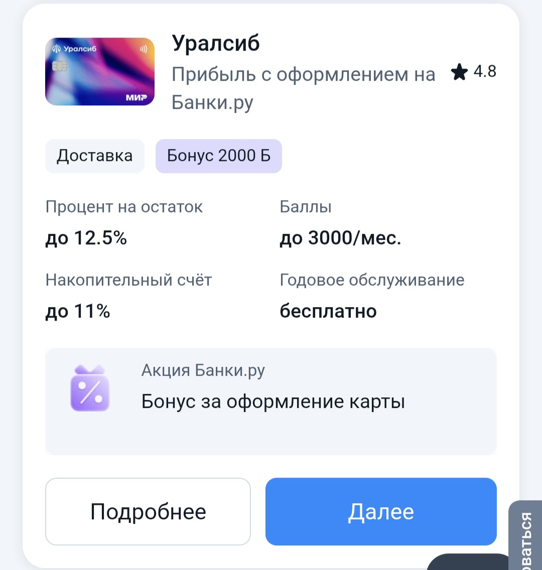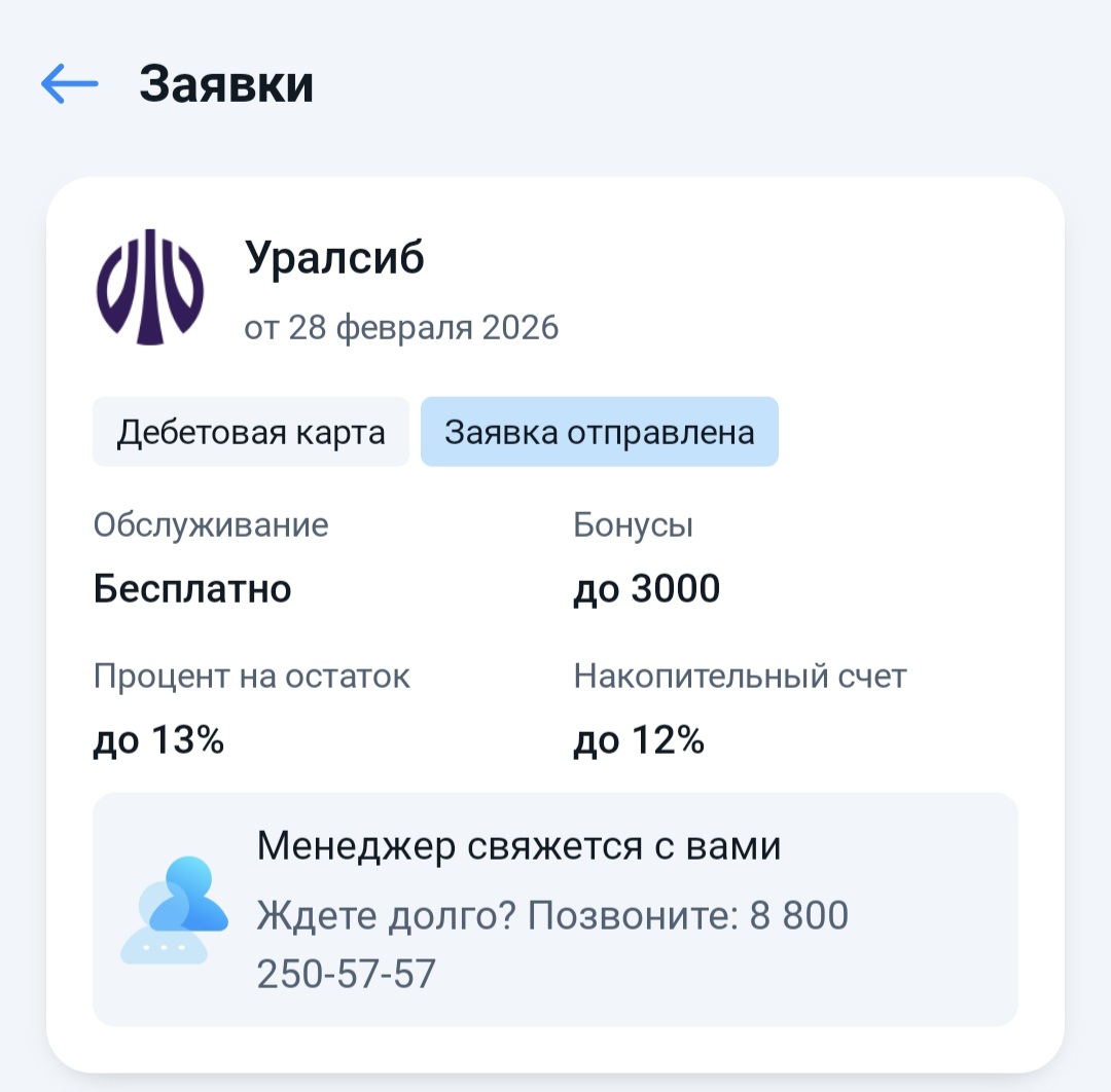 28.02.26 г я через ЛК маркетплейса оформила заявку на открытие дебетовой карты "Прибыль" Уралсиба с бонусом 2000Б от Банки.ру.