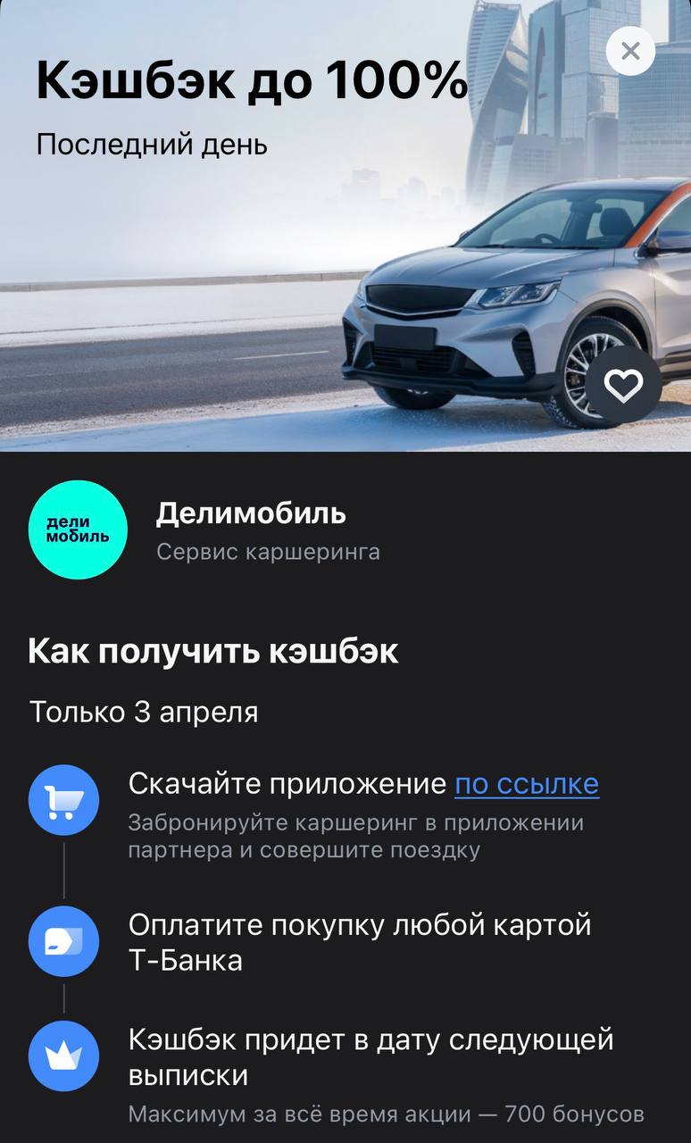 Сегодняшняя пятница в Т-Банке бьёт все рекорды по щедрости. Не успел я перекусить бесплатным сыром, о котором писал чуть раньше, как в разделе акций заметил ещё одно мощное предложение — кэшбэк 100% на поездку в Делимобиле. Лимит возврата — внушительные 700 рублей.