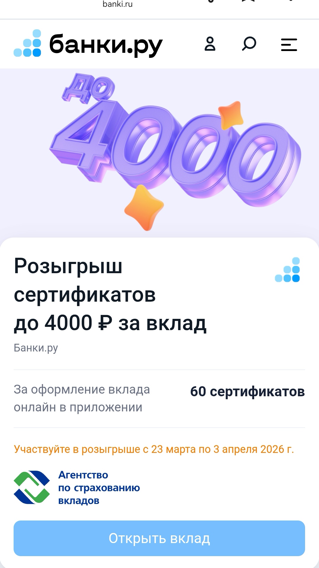 Оказывается, было на днях предложение открыть вклад онлайн на сумму от 100 000 рублей из списка предложенных банков и поучаствовать в розыгрыше сертификатов в "Мегамаркет".