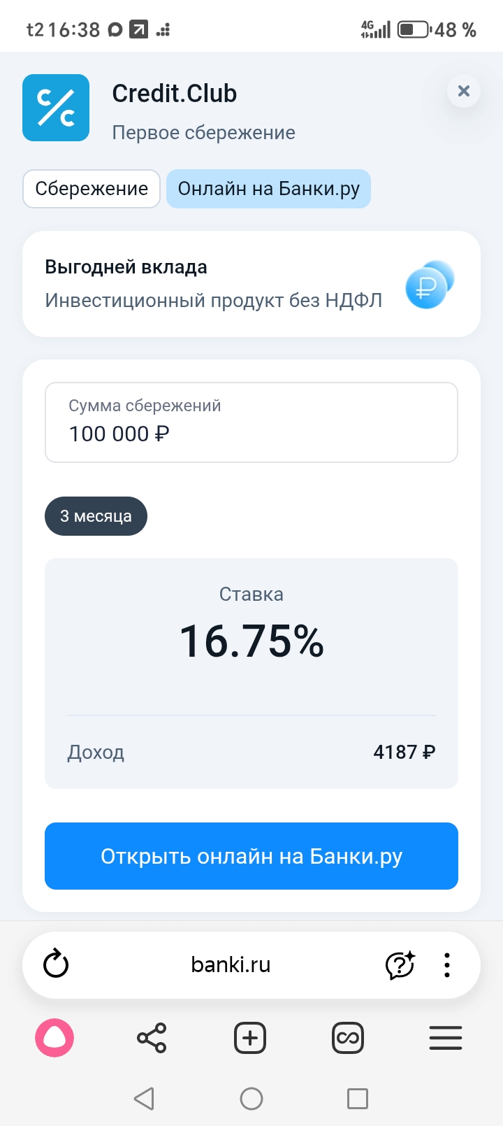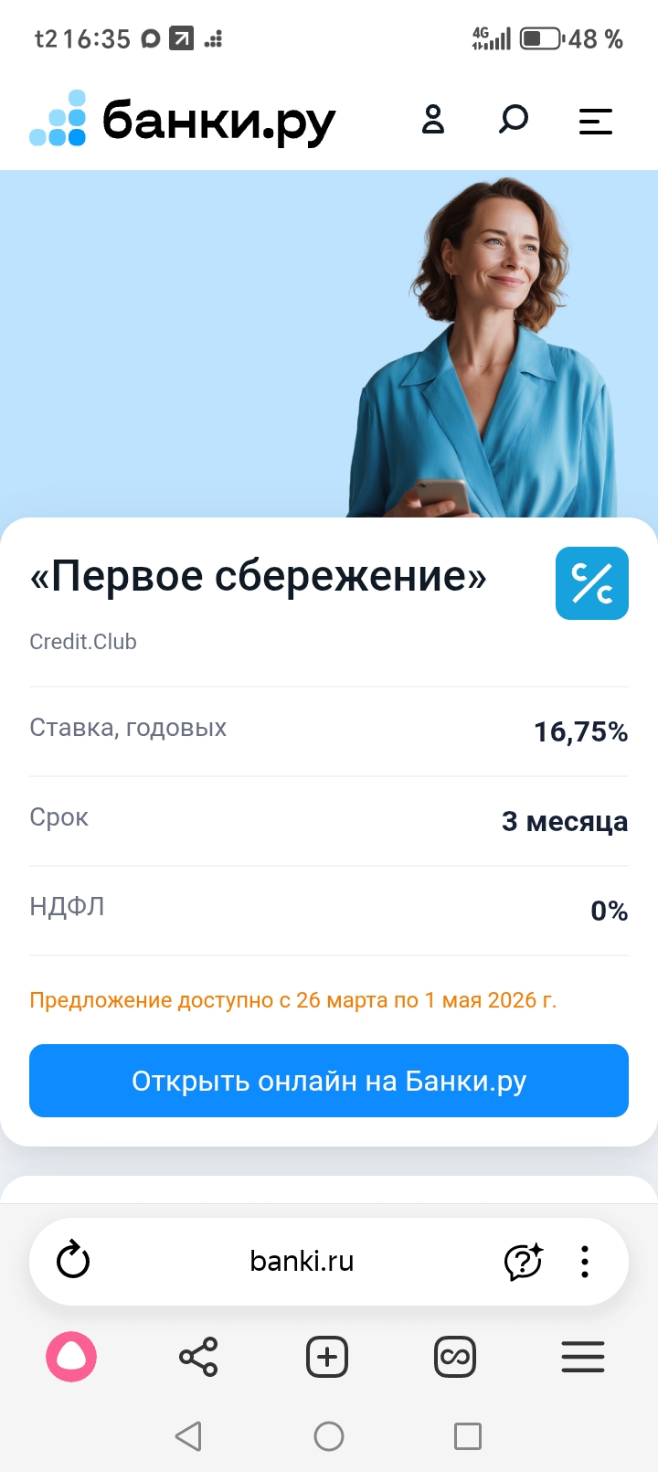 Этот продукт со ставкой 16,75% - на 3 месяца без НДФЛ. Это специальное предложение, которое действует с 26 марта по 1 мая. https://www.banki.ru/specials/investment/first_saving/?source=profile30
