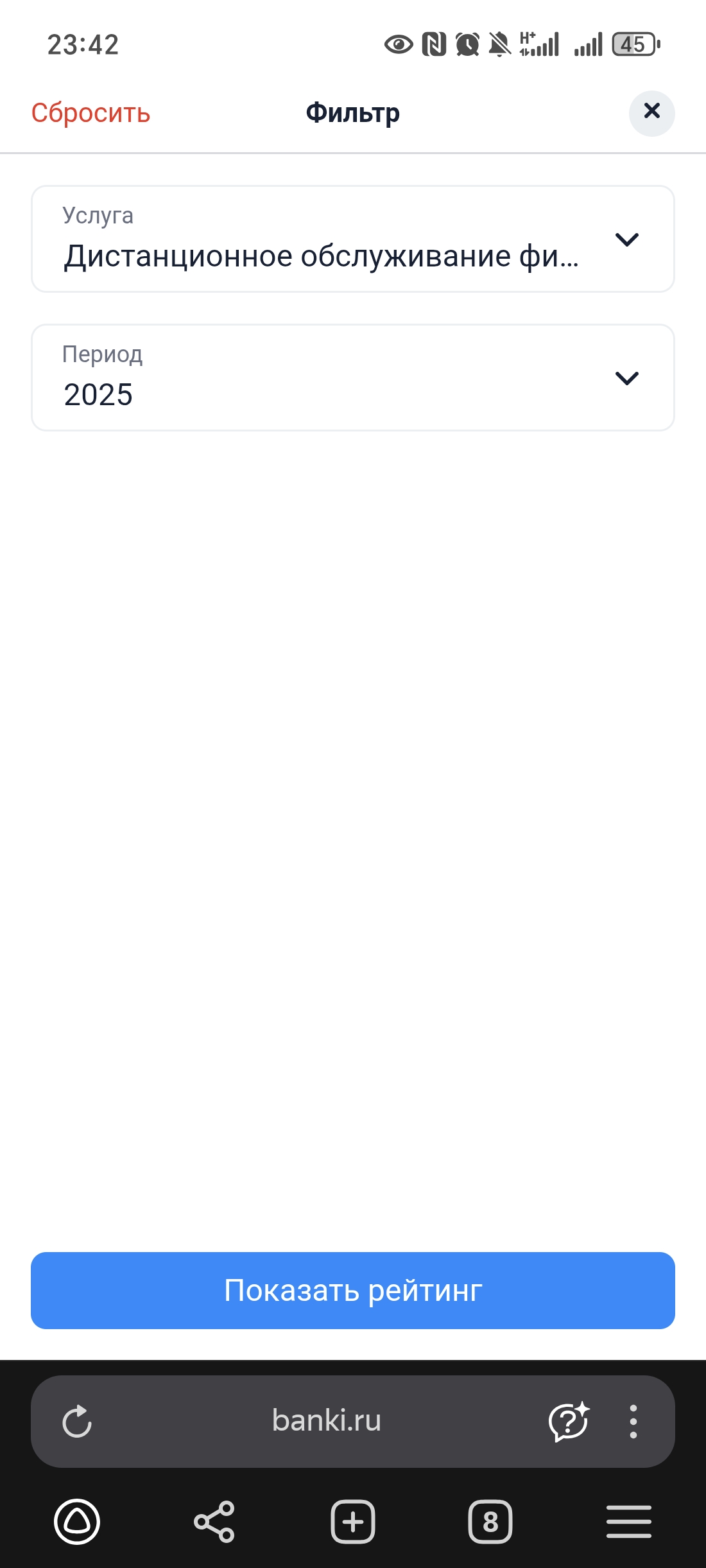 Моя задача была выбрать банк для вклада, но при этом хотелось, чтобы у него была высокая оценка за дистанционное обслуживание физических лиц, так как опыт с прошлым банком именно в этой сфере оказался неудачным. Я открыл народный рейтинг банков, в фильтрах выбрал период за 2025 год, выбрал физ лица, далее выбрал пункт «дистанционное обслуживание физических лиц» и нажал «показать рейтинг». На первом месте был Совком банк, на втором Альфа-Банк, на третьем Ozon Банк.