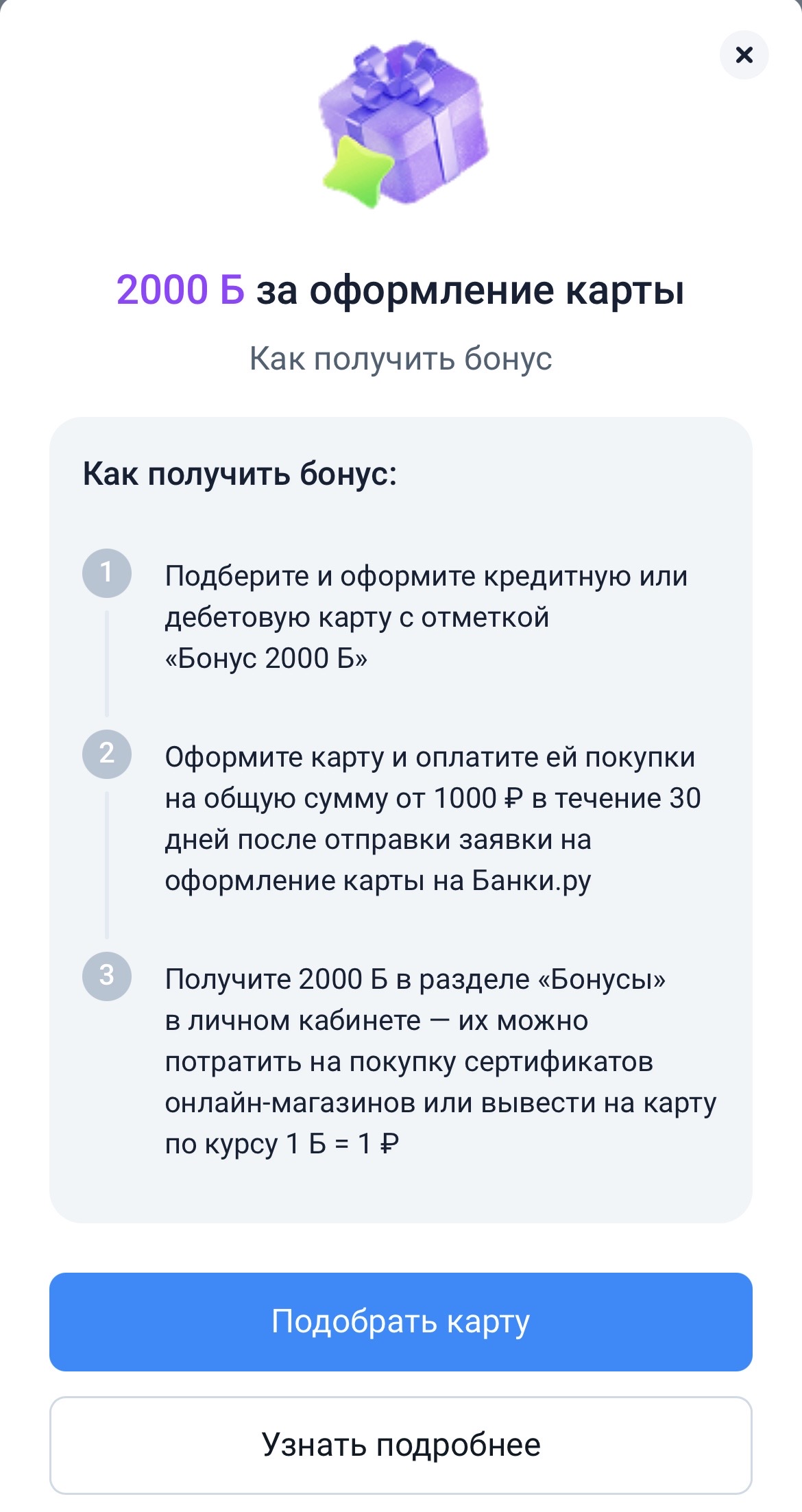 Если всё равно планируете оформлять карту — сделайте это через Банки.ру и посмотрите, есть ли бонус. Условия обычно простые: тратите 1000 рублей за месяц, получаете 2000 бонусов. По сути, вам дарят 2000 рублей за то, что вы просто пользуетесь картой как обычно.