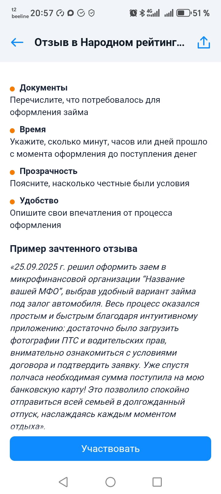 Ознакомьтесь, пожалуйста, с алгоритмом написания Отзыва для МФО, а также с актуальным примером написания Отзыва.