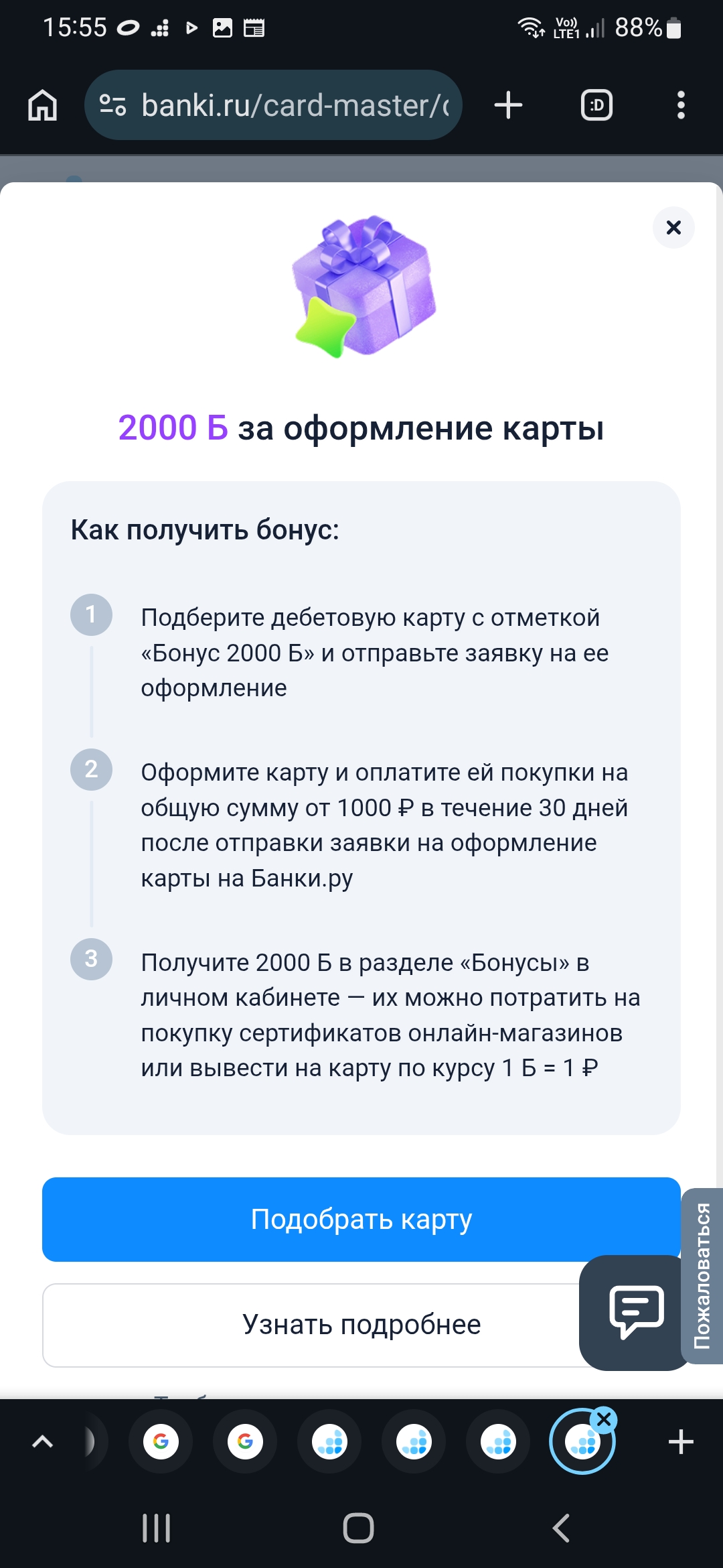 Важнее быть осторожнее, ведь в акции могут участвовать только те зарегистрированные пользователи Банки.ру, которые не подавали заявки на участие в течение определенного предыдущего времени, в зависимости от выбранной карты банка партнера. Увидить все условия представляется возможным в этом окне с названием "2000 Б за оформление карты", перейдя по ссылке с надписью мелкими буквами Правила акции, увидить краткую интересную информацию об акции - перейдя по кнопке Узнать подробнее. Нажатие кнопки Подобрать карту в этом окне возвращает к разделу выбора типа карт.