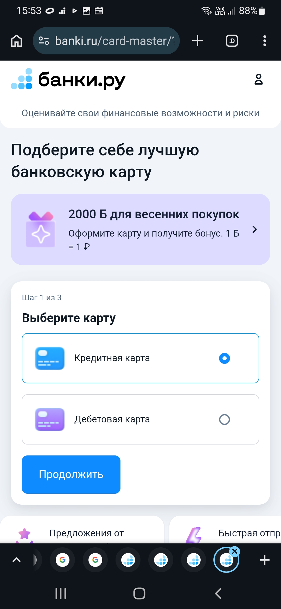 Нажатие кнопки Продолжить этой страницы ведет к списку карт, который в первом своем блоке отражает карты заданные условиями фильтра. Во втором все остальные из всех предложений. Выше списка карт будет ждать уже рассмотренная область ссылки с надписью "2000 Б для весенних покупок" ведущая к повторяющемуся содержанию условий акции, правилам.