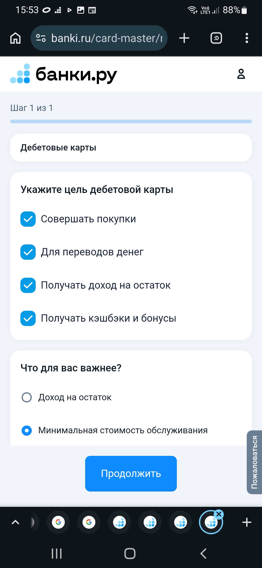 Замечательно, то, что есть фильтр функционала выбираемой карты, используя который, становится возможным подобрать карту под свои нужды. Этот фильтр появится на следующей странице, после нажатия кнопки Продолжить окна выбора типа карт.