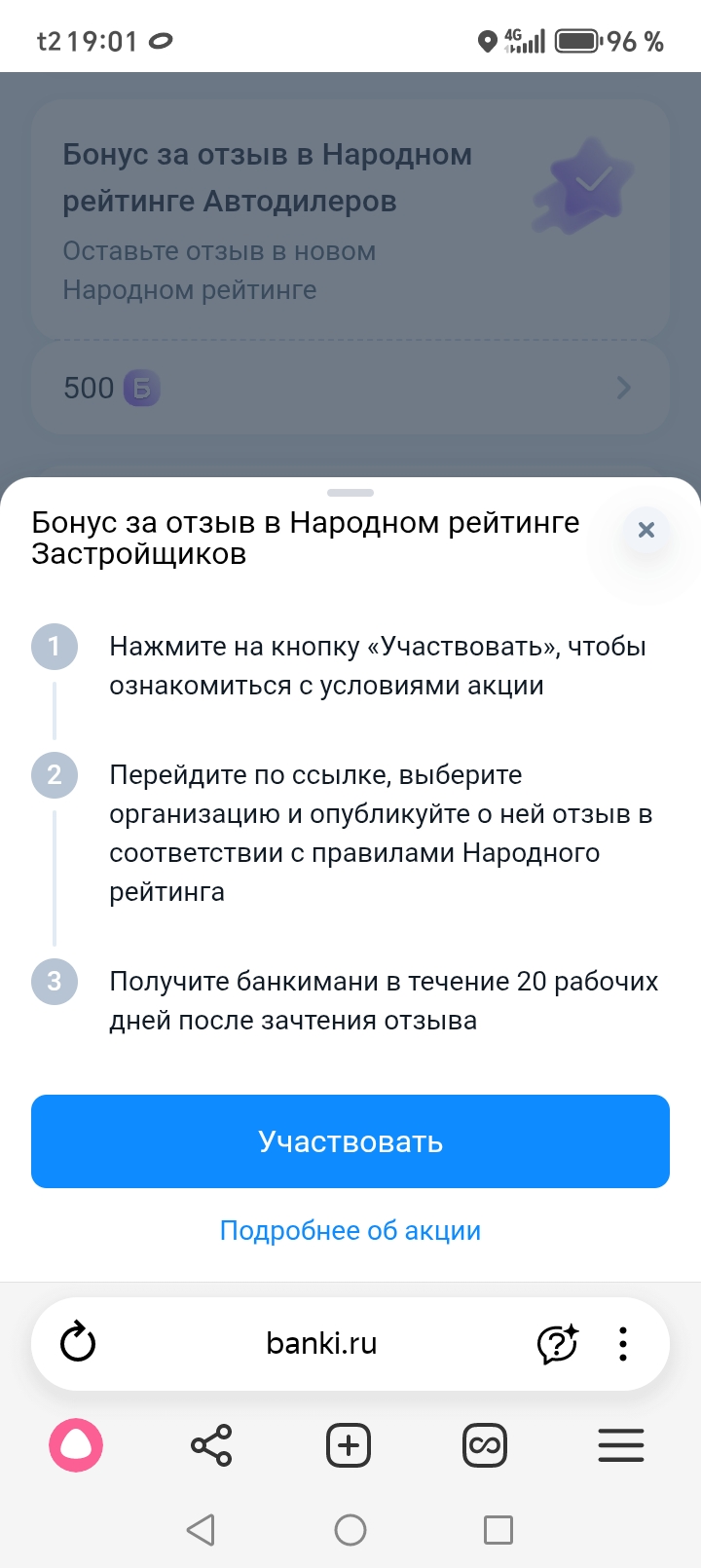 Плавая по волнам самого большого и популярного Маркетплейса Банки Ру натолкнулась на предложение : Получить Бонусы за Отзыв в Народном рейтинге застройщиков.