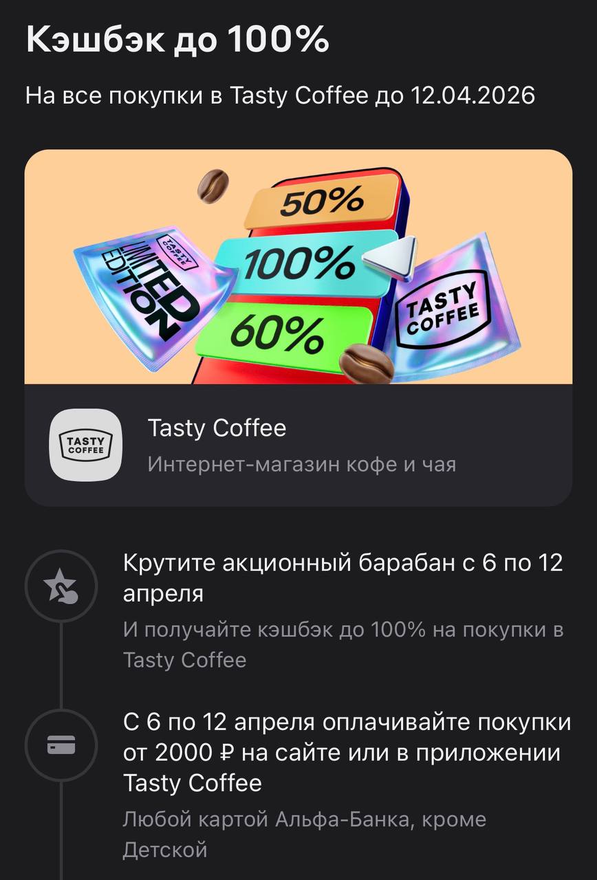 Т-Банк не стал выдумывать велосипед. Они просто дали 50% кэшбэка на любую сумму покупки в Tasty Coffee. Лимит возврата — 450 рублей. Для меня это идеальный вариант: я заказал ровно столько кофе, сколько мне нужно сейчас, применил дополнительно промокод самого магазина и получил свои деньги обратно без лишних вопросов. Никаких «порогов» входа — берешь на 800-1000 рублей и забираешь профит. В 2026 году такая прямолинейность ценится выше любых «барабанов удачи». Ранее я писал пост по поводу данного кэшбэка, можете найти его у меня в профиле.