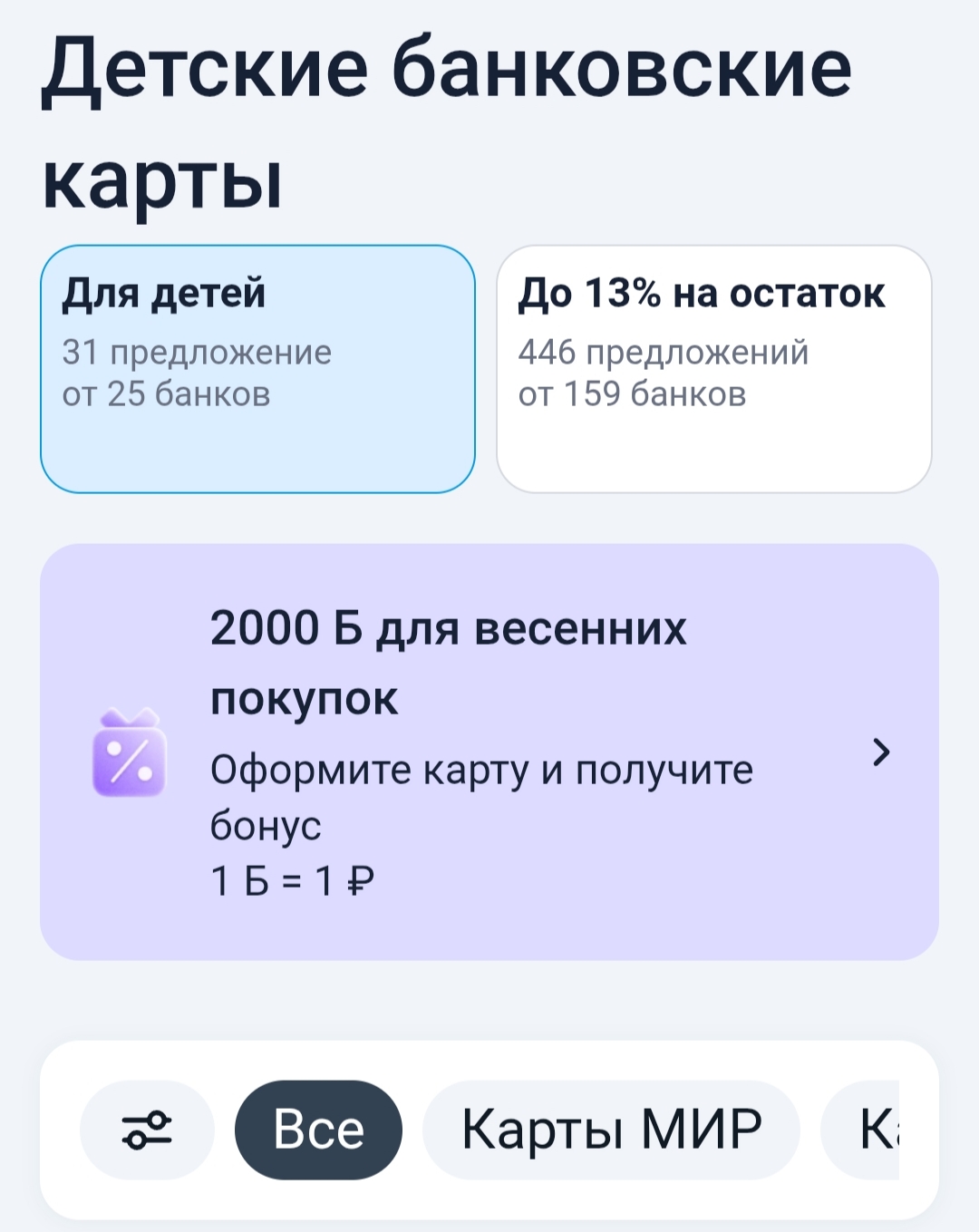 Детская банковская карта превращает абстрактное желание купить что-то в конкретные цифры на экране. Маркетплейс "Банки.ру" предлагает выбрать 31 предложение от 25 банков!