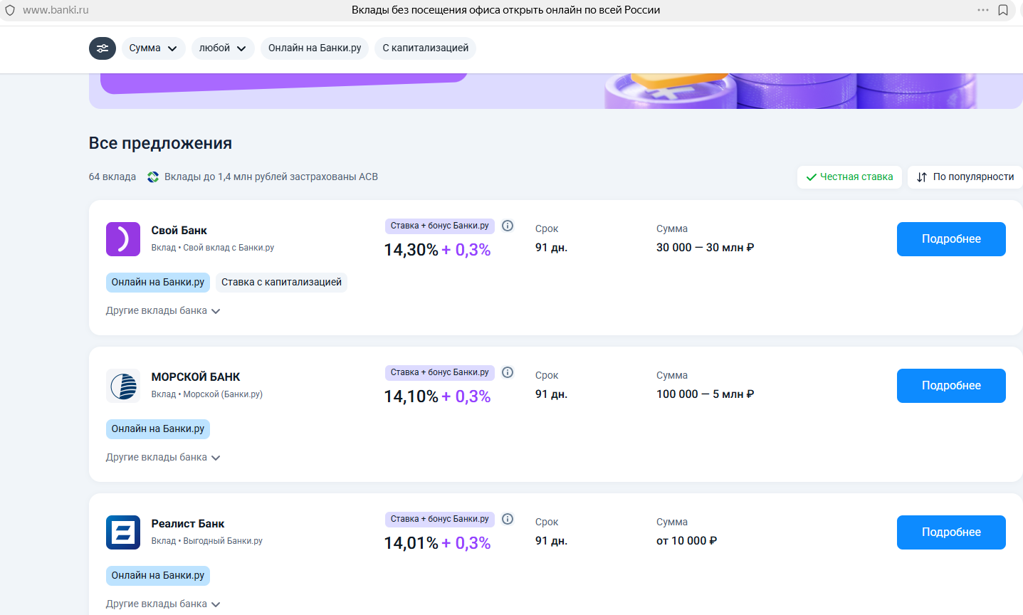 К моему большому сожалению, ставки по вкладам в банках неизменно снижаются. Есть еще один повод для сожаления, и это то, что наибольшие проценты банки начисляют обычно на так называемые "новые деньги". И банков в каждом населенном пункте ограниченное количество. Но нам в помощь, как всегда, сайт Банки.ру! Промониторила я все предложения по вкладам, вот здесь: https://www.banki.ru/products/deposits/catalogue/vkladyi_bez_posescheniya_ofisa/, а предложения то оказались неплохие, а...