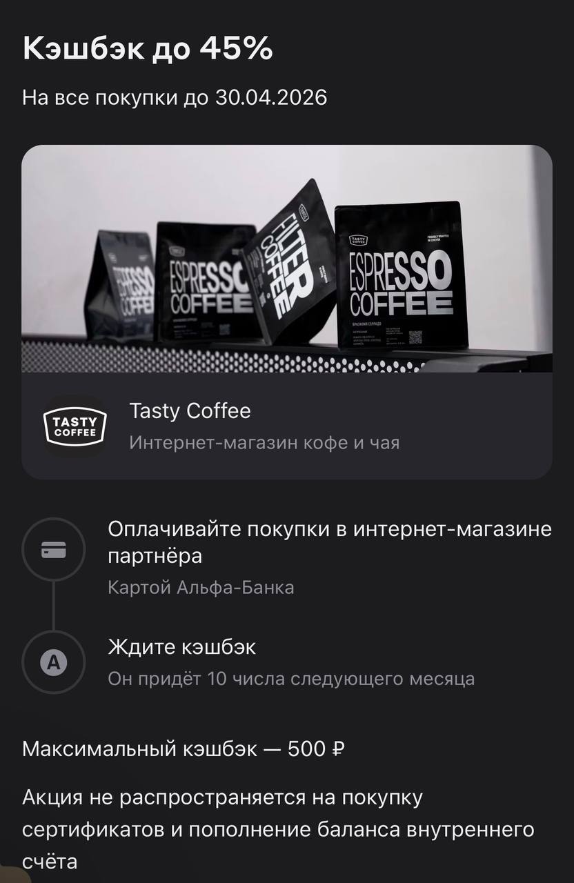 Альфа-Банк продолжает конкурировать с Т-Банком в категории спецпредложений и запустил крупную акцию на покупку свежеобжаренного кофе бренда Tasty Coffee. До конца апреля можно вернуть до 45% от стоимости заказа, что делает это предложение одним из самых выгодных для любителей качественных напитков. Акция ориентирована на онлайн-покупки в интернет-магазине партнера, и хотя процент возврата выглядит внушительно, у него есть четкий денежный лимит, который стоит учитывать при наполнении корзины.