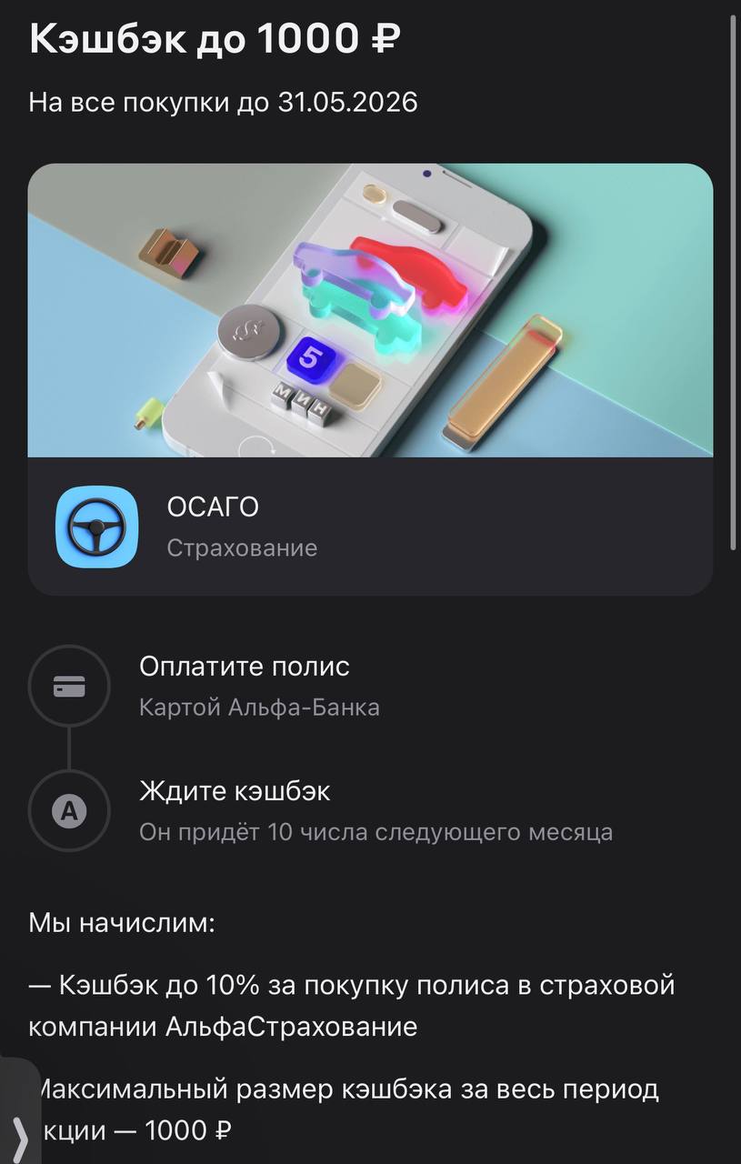 Альфа-Банк выкатил акцию для автомобилистов, предлагая вернуть до 10% от стоимости полиса ОСАГО. Это партнерская программа, которая действует до конца мая. Если у вас подходит срок продления страховки, сейчас отличный момент закрыть этот вопрос и получить часть денег обратно на счет. В отличие от мелких покупок, здесь сумма возврата может быть весьма ощутимой, но есть свои нюансы по выбору страховой компании и отображению бонусов в мобильном приложении.
