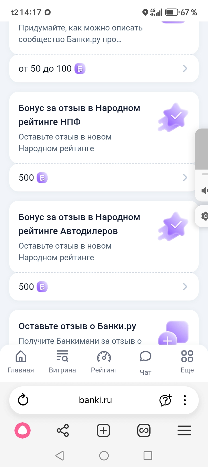 Среди множества продуктов, отдельно выделяются предложения написать Отзывы в Народном Рейтинге. Я заосрила своё внимание на предложении написать Отзыв в Народном рейтинге Автодилеров на платформе Банки. Ру и получить БОНУС. https://www.banki.ru/account-new/loyalty/earn/⬅️ Здесь можно ознакомиться с информацией по данному предложению.