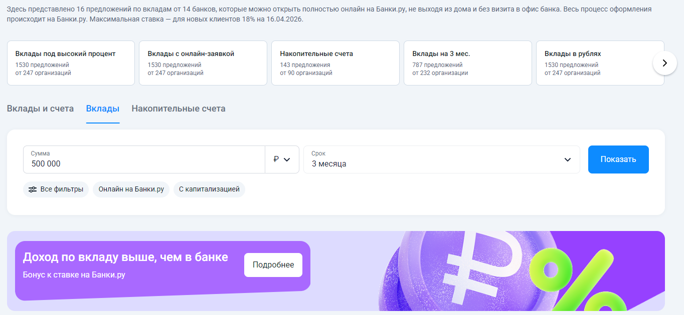 Когда у меня накопилась некоторая сумма, которую я не планировал тратить в ближайший год, решение казалось очевидным — открыть вклад. Но вместо того чтобы пойти в свой зарплатный банк, как делал раньше, я решил потратить время и изучить рынок. Я зашел на финансовый маркетплейс Банки.ру и с удивлением обнаружил, что вклады, которые на первый взгляд выглядели одинаково, на деле сильно отличаются по доходности. А главное — самый высокий процент не всегда означает самую большую прибыль в конце...