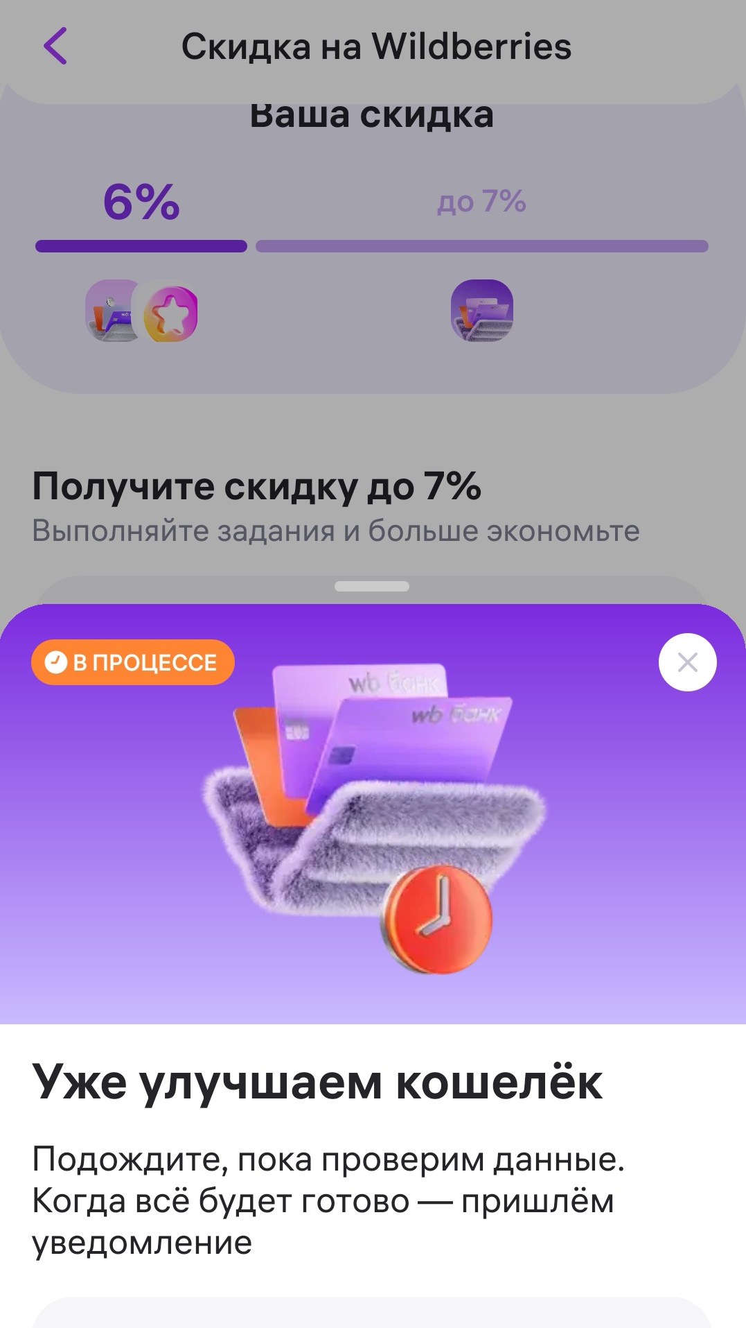 Так что, пока я в ожидании открытия счета в Вайлдберриз Банке. Также после улучшения кошелька, можно заказать пластиковую карту Вайлдберриз Банка, по этой карте можно даже получать кэшбек 5% на оплату в супермаркетах. Кэшбек ягодками, тратить их можно на покупки на маркетплейсе ВБ.