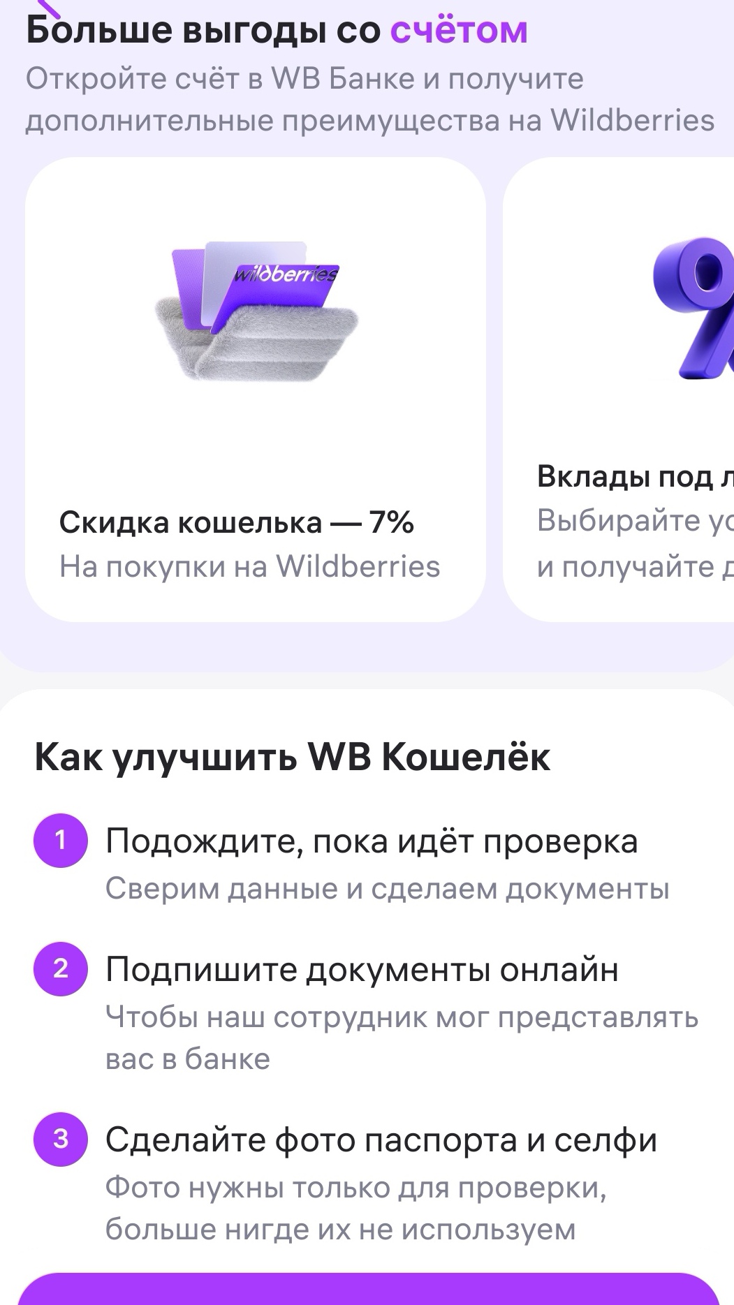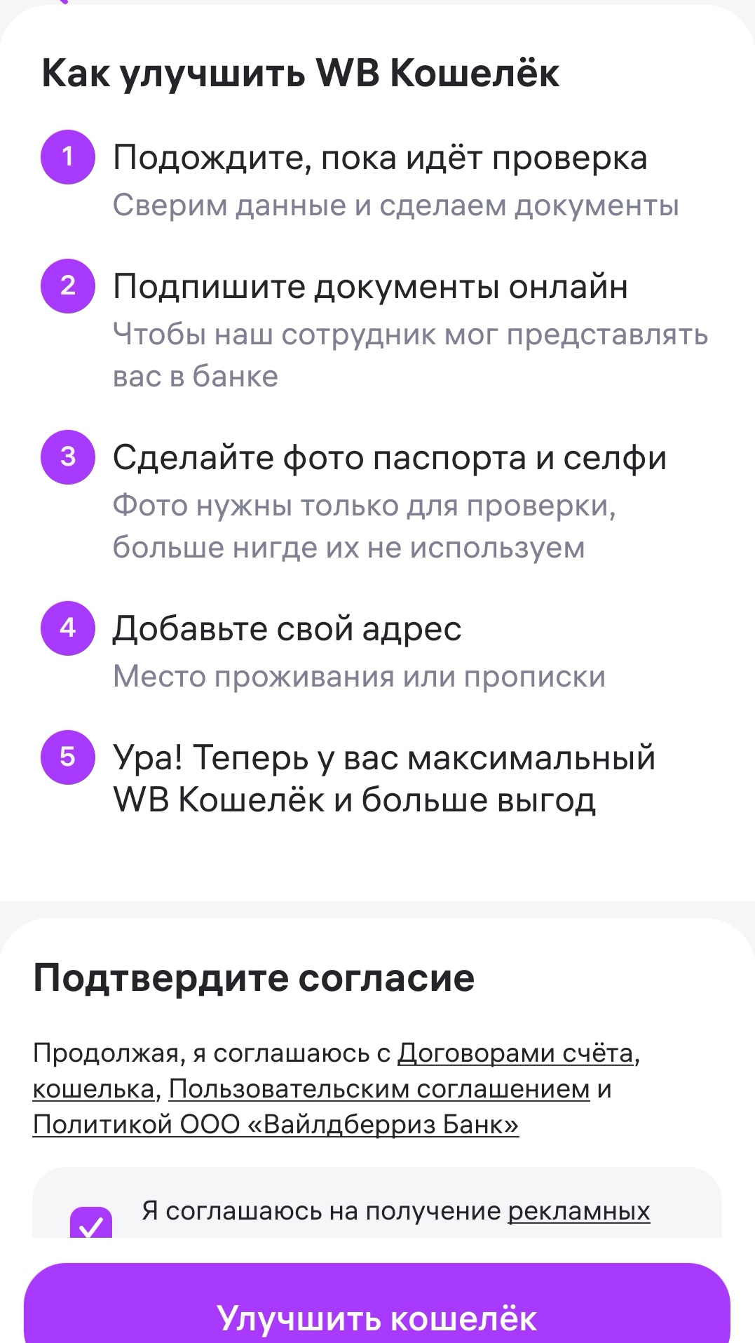 На маркетплейсе Вайлдберриз я, конечно, совершаю периодически покупки, оплачиваю ВБ кошельком. Но для открытия счета в ВБ банке этого недостаточно. Необходимо улучшить кошелек.