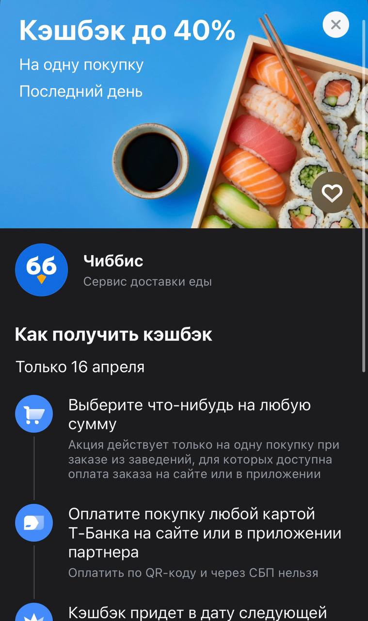 Вечер четверга — это то самое время, когда силы на готовку медленно иссякают, а желание побаловать себя чем-то вкусным только растет. Сегодня, 16 апреля, Т-Банк решил сделать этот выбор очевидным, выкатив однодневное спецпредложение на сервис доставки еды «Чиббис». Можно вернуть до 40% от стоимости заказа, что фактически превращает любой ваш ужин в праздник экономного гурмана. Это отличная возможность заказать любимые роллы, пиццу или бургеры с такой скидкой, которую редко встретишь даже в...