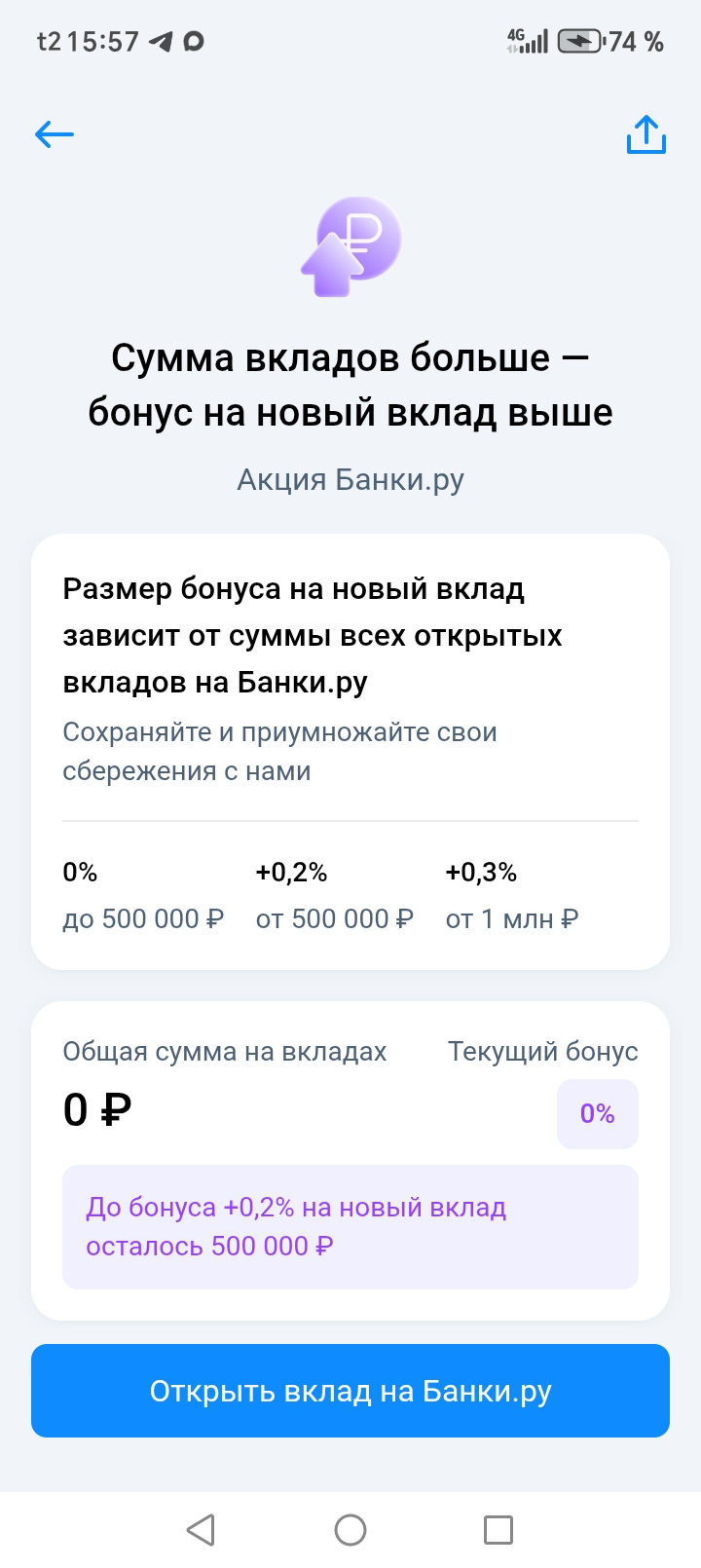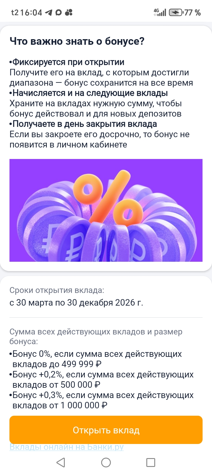 Размер бонуса на новый Вклад зависит от суммы всех открытых вкладов на Банки. Ру.